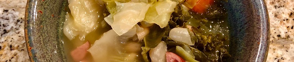 The original recipe was from Food and Wine for cabbage and kale soup with farro. I made mine simpler by using cannellini beans instead of farro (but I am sure it would be good with farro too!) I subbed in 2 oz. of diced turkey sausage for the pancetta, 1/4 tsp. of fish sauce for the anchovies, and added a chopped carrot. I cooked my soup on the stovetop rather than the oven. It took about an hour. The idea here is to use what you have and you will probably make a dish as good if not better than the original.