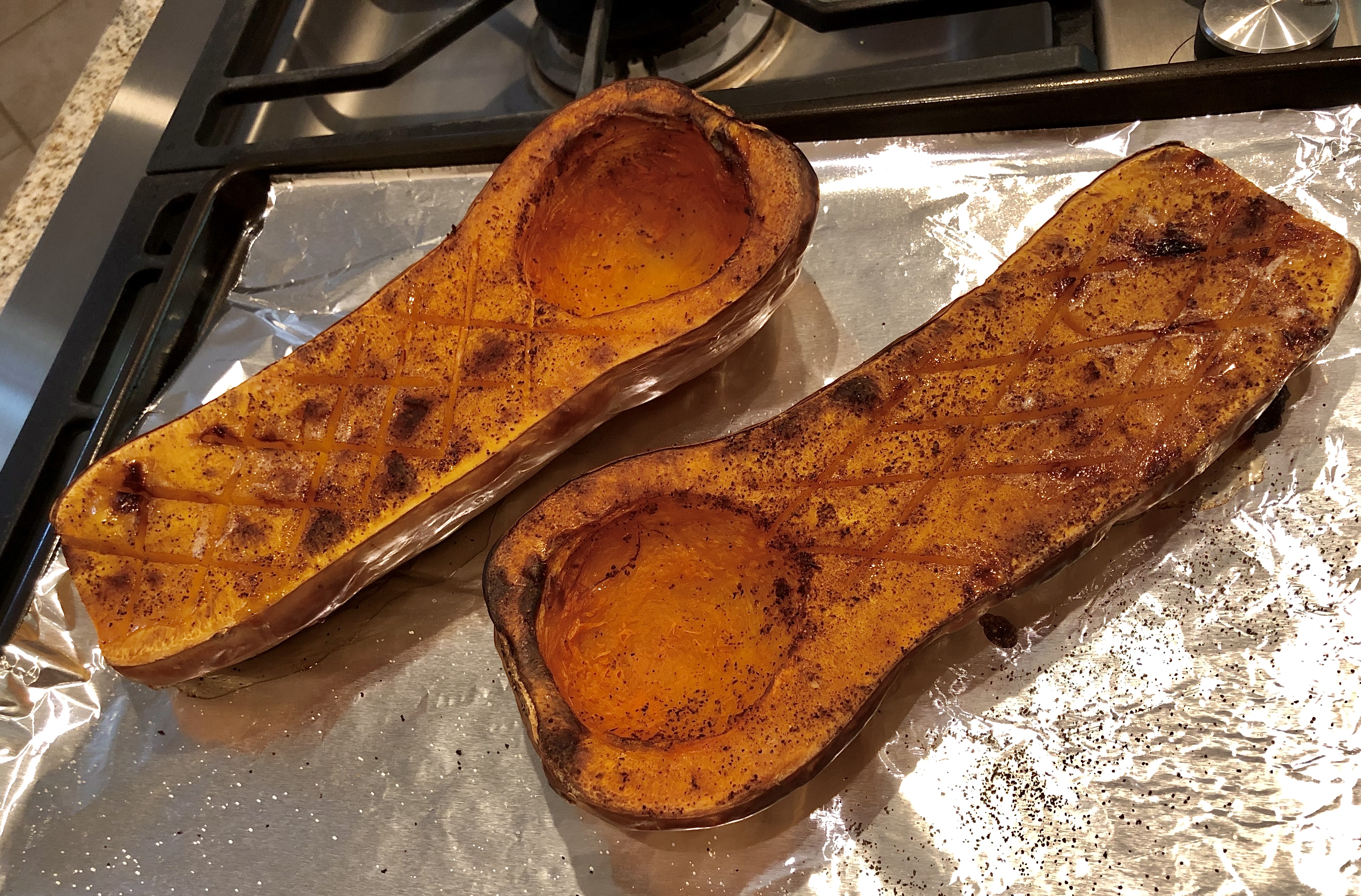 My early prep for tonight’s classic chicken dinner included roasting a butternut squash. Cut the squash in half longitudinally, scoop out the seeds, rub some olive oil on the cut side that you have scored, season with salt and nutmeg and put it in the oven for 1 hour at 400F. When it is cool enough to handle, scrape the innards off from the skin. I used an ice cream scoop. Add a little butter or faux butter and mash it up. You will probably have to add additional salt.