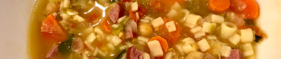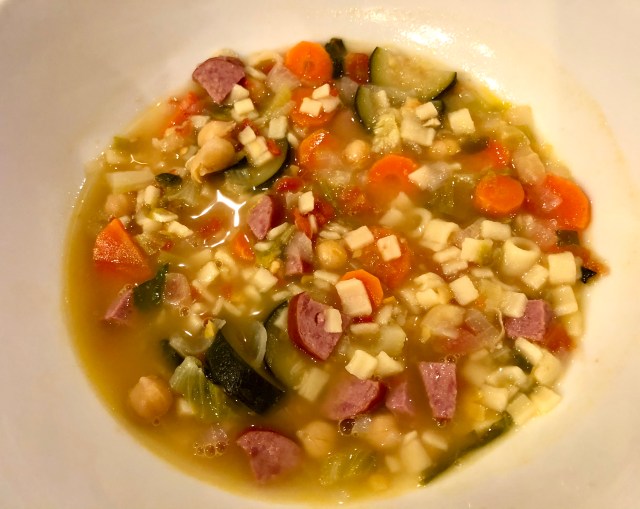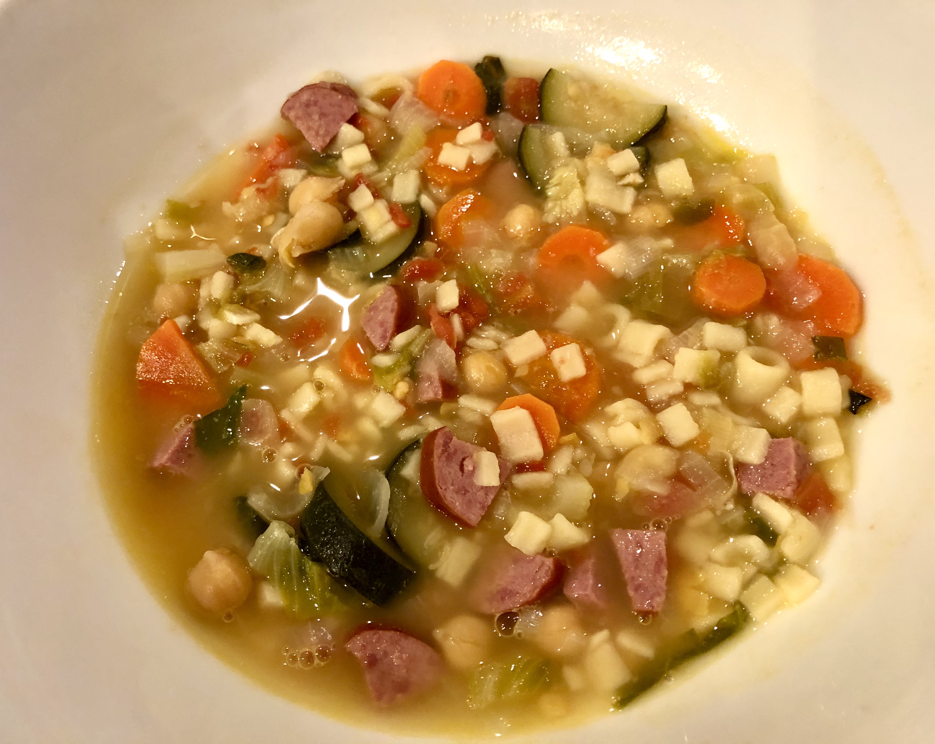 11/13/20 Chickpea stew which we froze before leaving is our saner choice when we got home last night. I added some additional broth and 2 oz. of turkey sausage