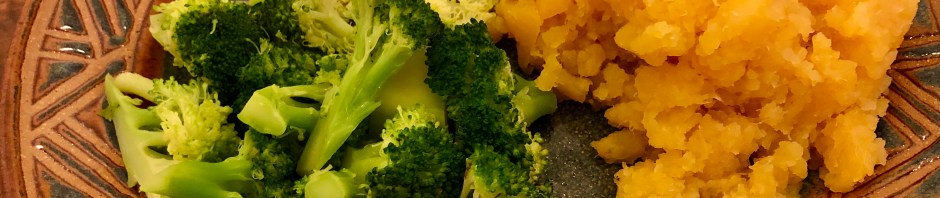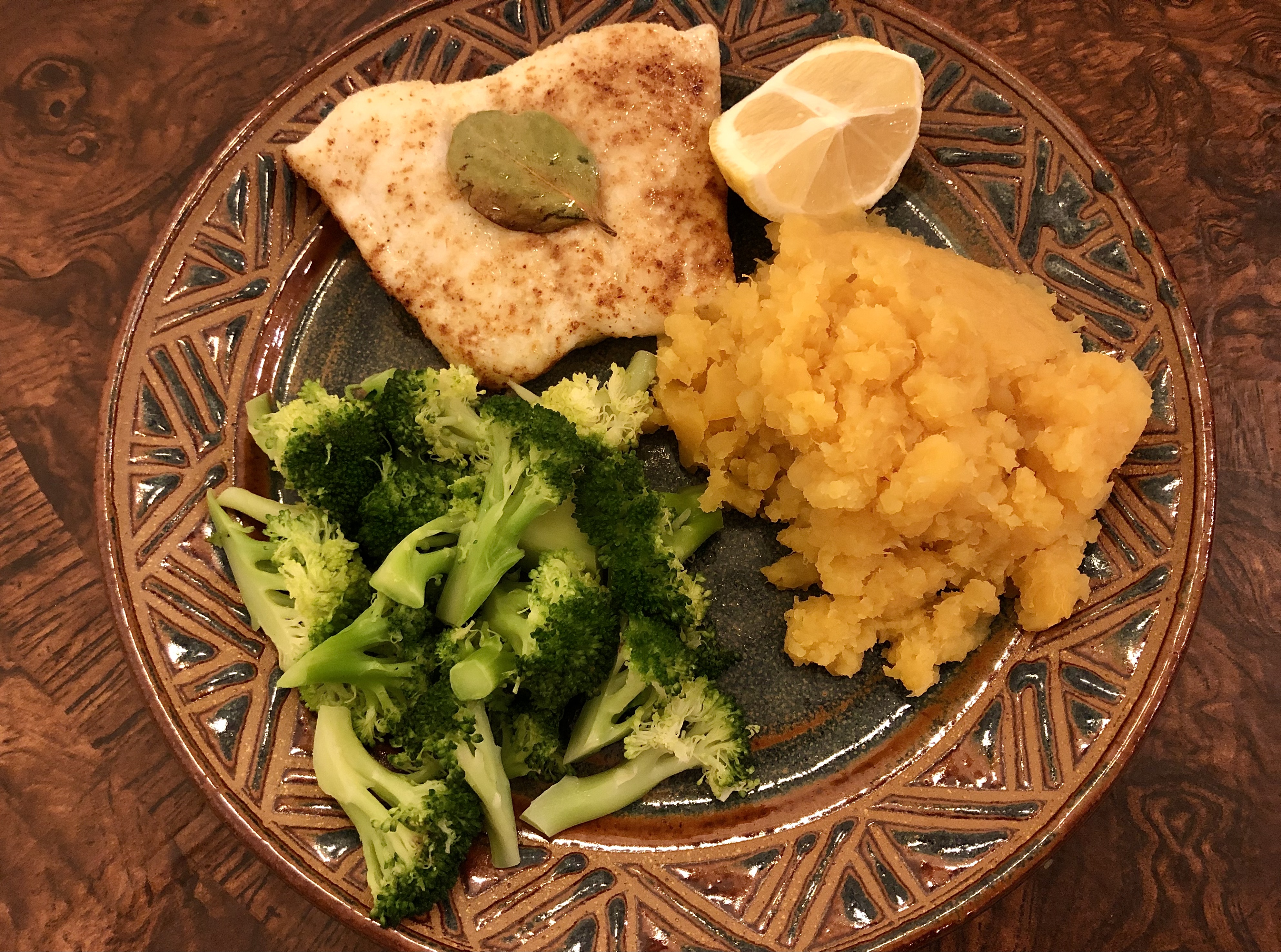 John cooks the sea bass in the oven at 400F and has to stagger the fish cooking times since one piece is thick and takes about 16 minutes and the other is thin and takes about 2-3 minutes less. Starting before the fish, I cooked the rutabaga which I peeled and cut into small chunks in the Instant Pot for 15 minutes. I used a delayed pressure release and then mashed it up with a tablespoon of light butter. The broccoli had a quick steam/sauté and was finished with the light butter as well.