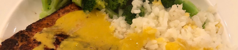 We were going for quick, nutritious, and delicious tonight and hit that trifecta of speedy, healthful, and yummy. John had made a bunch of rice on Monday to use during the week so all I had to do was mix in some seasoned cauliflower rice and warm it up in the microwave. Using half white rice and half cauliflower rice means I can have a larger portion and fewer calories. Win-win! The salmon took 5 minutes to cook and I cut the broccoli up in fairly small pieces so it would cook in about the same time as the fish. I finished my plate with a mustard sauce which consisted of mustard, sweetener, and water.