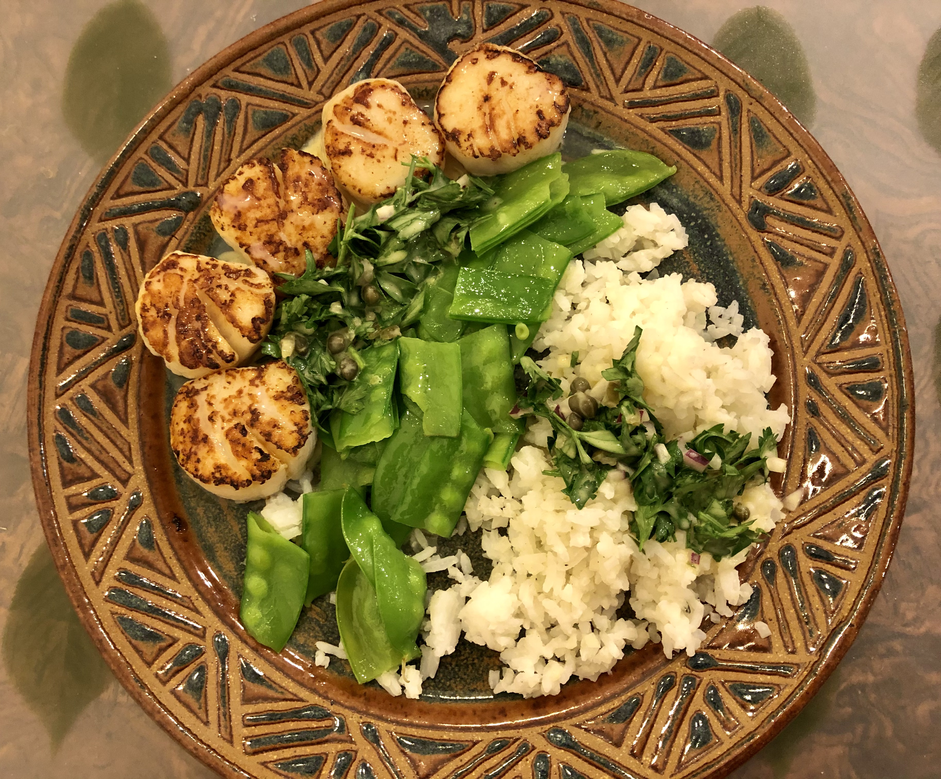 Along with my usual cauliflower rice/white rice mix and sautéed snow peas, I made a kind of loose parsley and caper tartar-ish sauce. John pronounced it delish! Ingredients are light mayo, yellow mustard, parsley, capers, a little olive oil, lemon juice, red onion, a splash of water, salt, pepper, and sriracha. Just keep tasting it until you like it!