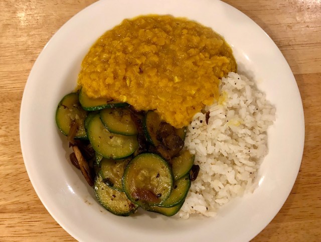 Afghani masoor dal, white rice/cauliflower rice mix, and sautéed zucchini, mushrooms,onions, and peppers