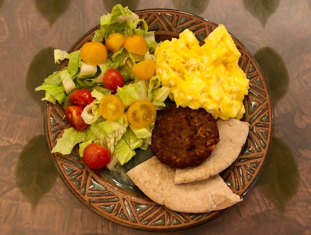Here we are back to the easiest dinner of the week, Breakfast For Dinner (BFD). John was busily concocting his omelet but I felt like, “Easy. All I want is easy.” So I made some simple soft scrambled eggs, microwaved a veggie patty, threw together a salad, and toasted a pita. After all the eating of the last week it was nice to eat a dinner that was not too big, not too fatty, and not too complicated. BFD, you are just what I needed!