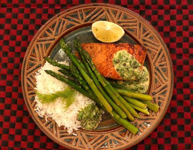 This dinner was as delicious as it looks! John, my fish and meat cook, did a superb job seasoning and cooking the salmon. I threw together a really tasty dill sauce by combining mayonnaise, yellow mustard, parsley, dill, capers, a splash of water, lemon juice, garlic powder, sriracha, and salt. My method is to taste and add more of something or figure out what is missing. John also made the rice earlier in the day and I steamed the asparagus while the salmon cooked. Dinner win!