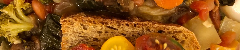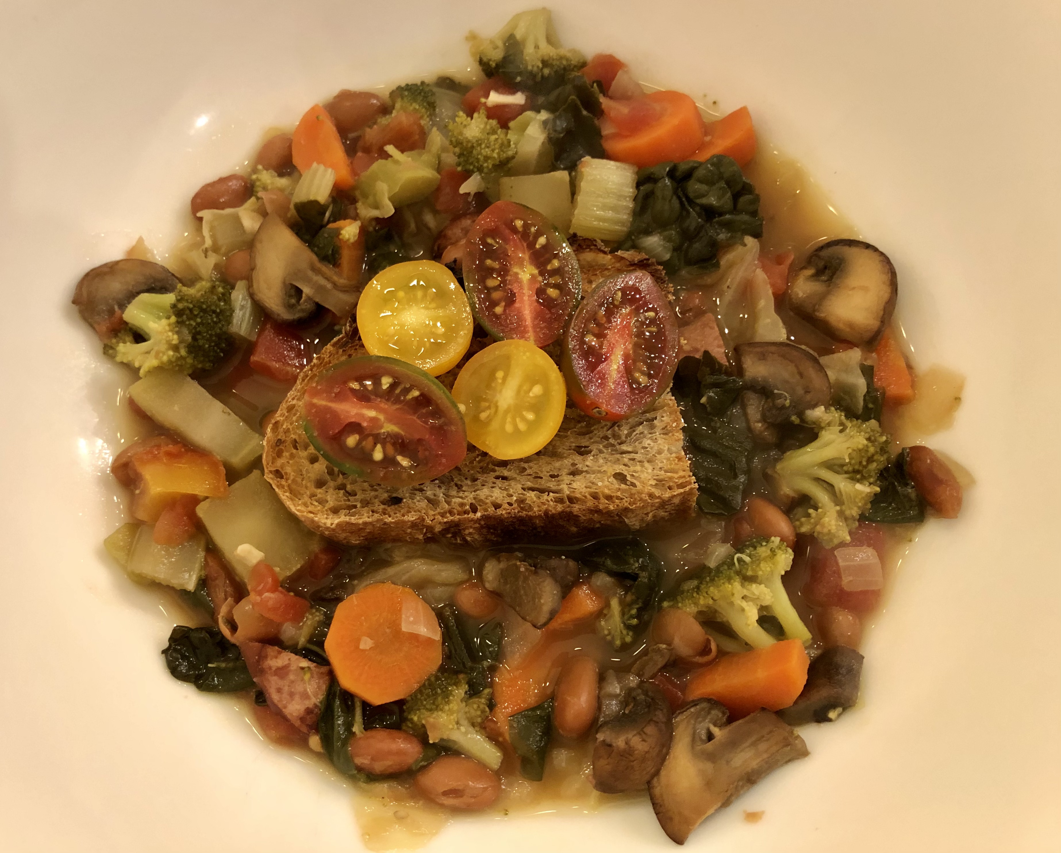 Anyway, we had not quite enough of it leftover for another dinner so I took most of the vegetables I had left in the refrigerator (mushrooms, broccoli, spinach, celery, and more carrots), sautéed them, and added “everything” to the pot along with some additional chicken stock. To serve I toasted a piece of rustic rye bread that our son made and floated it on top with a few fresh cherry tomatoes. What resulted was an easy, economical, healthy, filling dinner that we both enjoyed.