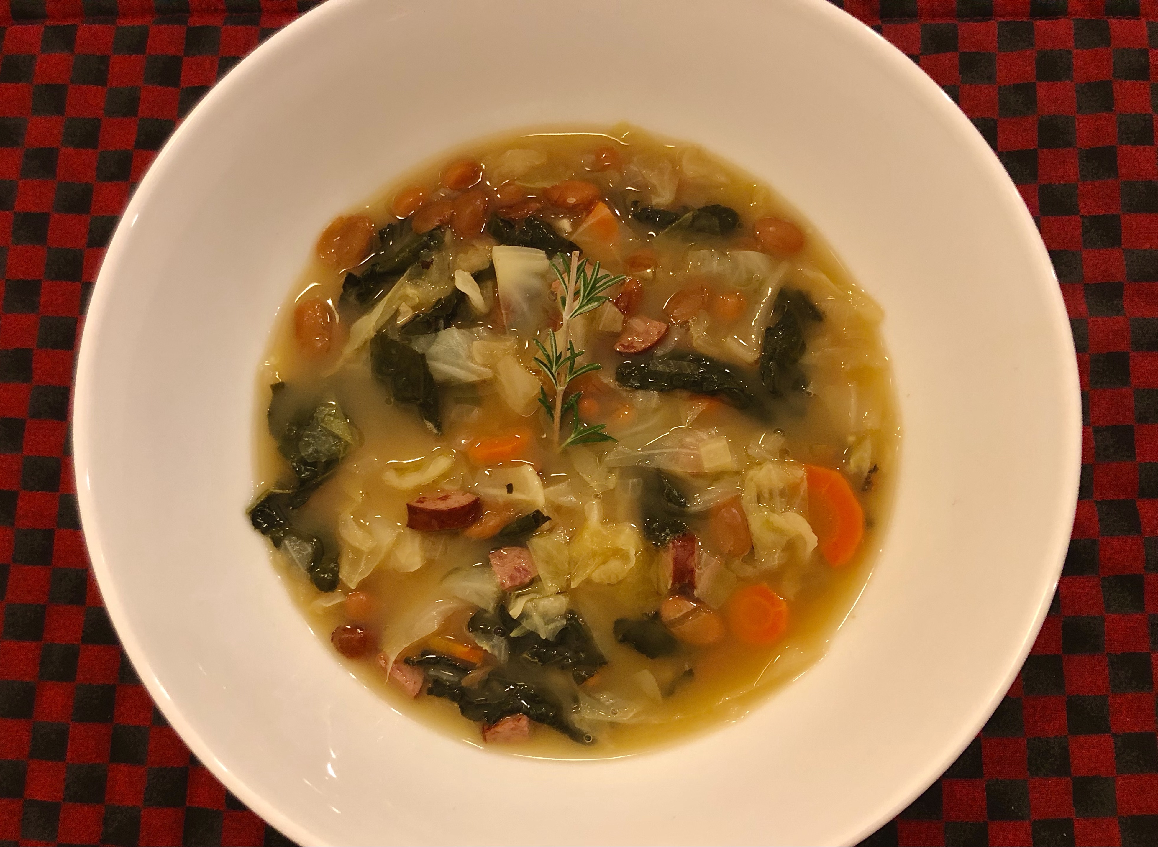 Saturday’s LFD (Leftovers For Dinner) started with a base of the soup we had on Thursday. Somehow I forgot to post it. The kale, cabbage, and white bean soup with a little chopped up smoked turkey sausage was delicious. Here is a picture of it.