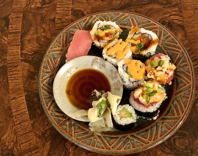 Weird combination for dinner no doubt. Tuesday was my birthday and the eating went all askew. I was supposed to be having a drinks and munch Zoom with my sisters but neither of them showed up with a drink or a munch. In the meantime John had gone out to buy a bunch of sushi for the event and for hors d’oeuvres for us. He went way overboard and bought a lot so we pitched our dinner plan and had sushi instead.
