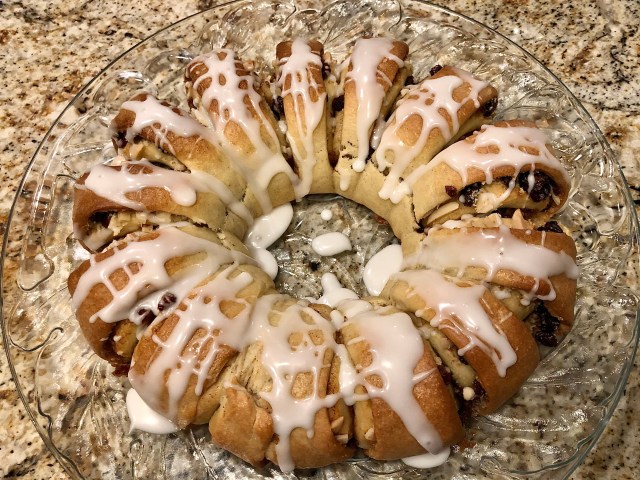 This was followed by a special childhood favorite. I had told my daughter that when I was a kid we had a bakery guy who came door to door a couple of times a week delivering bread and confections. There was a coffee cake which was full of almonds, raisins, and almond paste and coated in sugar that I loved but also that my father loved. Needless to say I did not get much of the coffee cake when my mom bought it. My daughter searched on line for a close substitute and came up with a recipe for a Swedish tea ring that approximated my childhood fav.