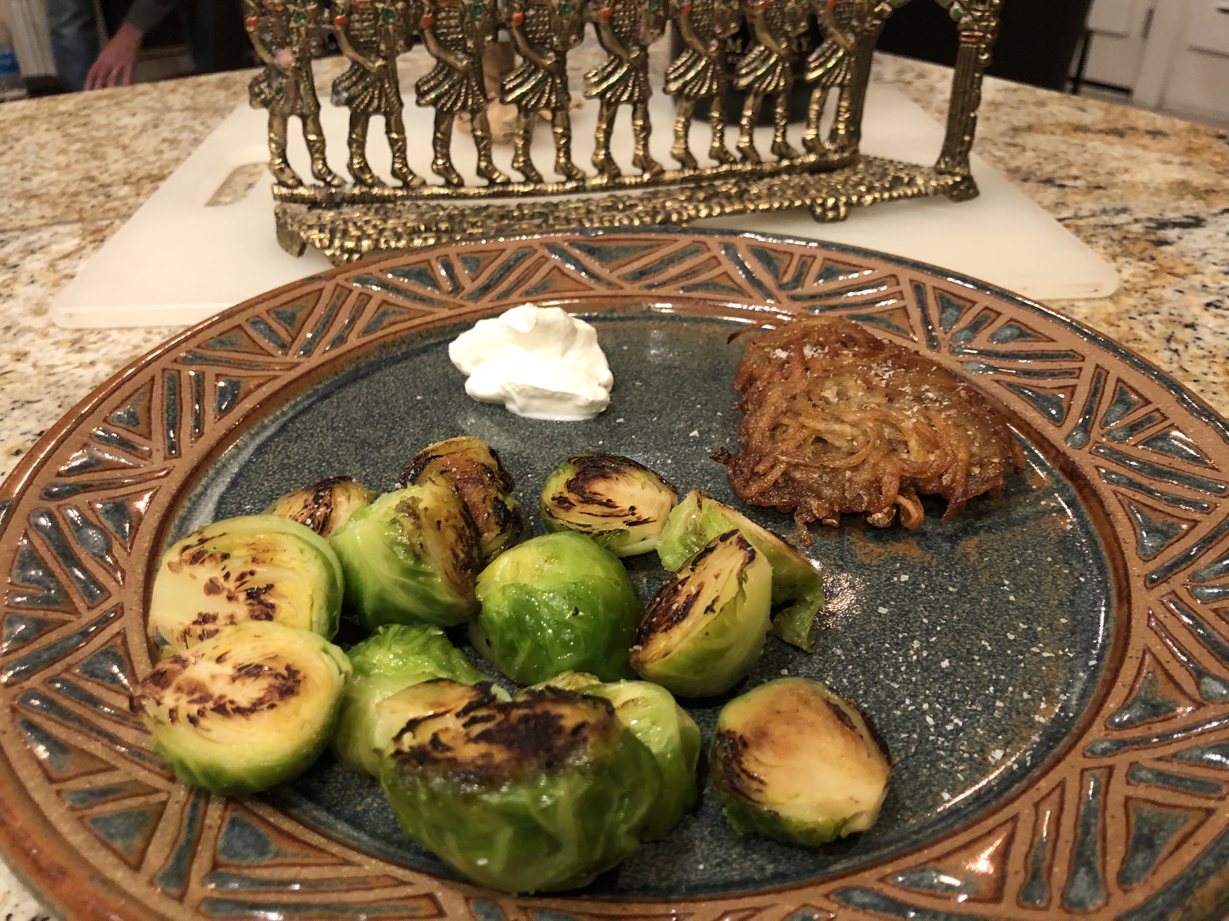 Hanukkah potato latke with Brussels sproutsJohn, who is the Jewish member of our family, always makes potato latkes on the first night of Hanukkah. He takes our electric wok out on the patio and heats up the oil and fries his potato latkes. They are so delicious. This is his super recipe –