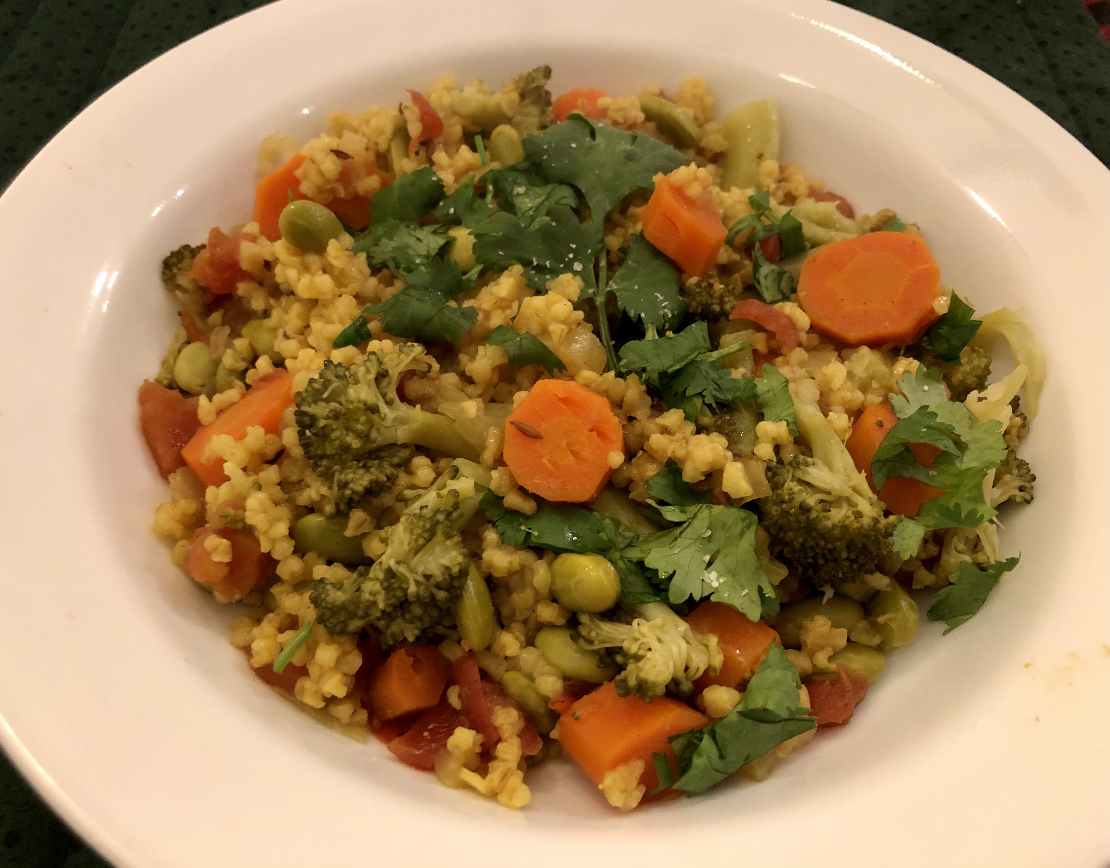 Cracked wheat is like the bulgur you use for tabbouleh. This is a new recipe and one that we will not be making again. You are supposed to put everything in the Instant Pot and cook it for 5 minutes on high pressure. Then we were told to let the pressure come down on its own which we did not do but rather let it come down partially on its own and then release the rest of the steam. It would not have mattered if we had released the pressure right away instead. It was mush. The vegetables were mush and the cracked wheat was mush. I figure if we want some dish with those spices and vegetables we will make it with dried chickpeas or lentils. Never put vegetables that you do not want to have come out like a purée in the pressure cooker for 5 minutes. They were so sad (especially the broccoli.)