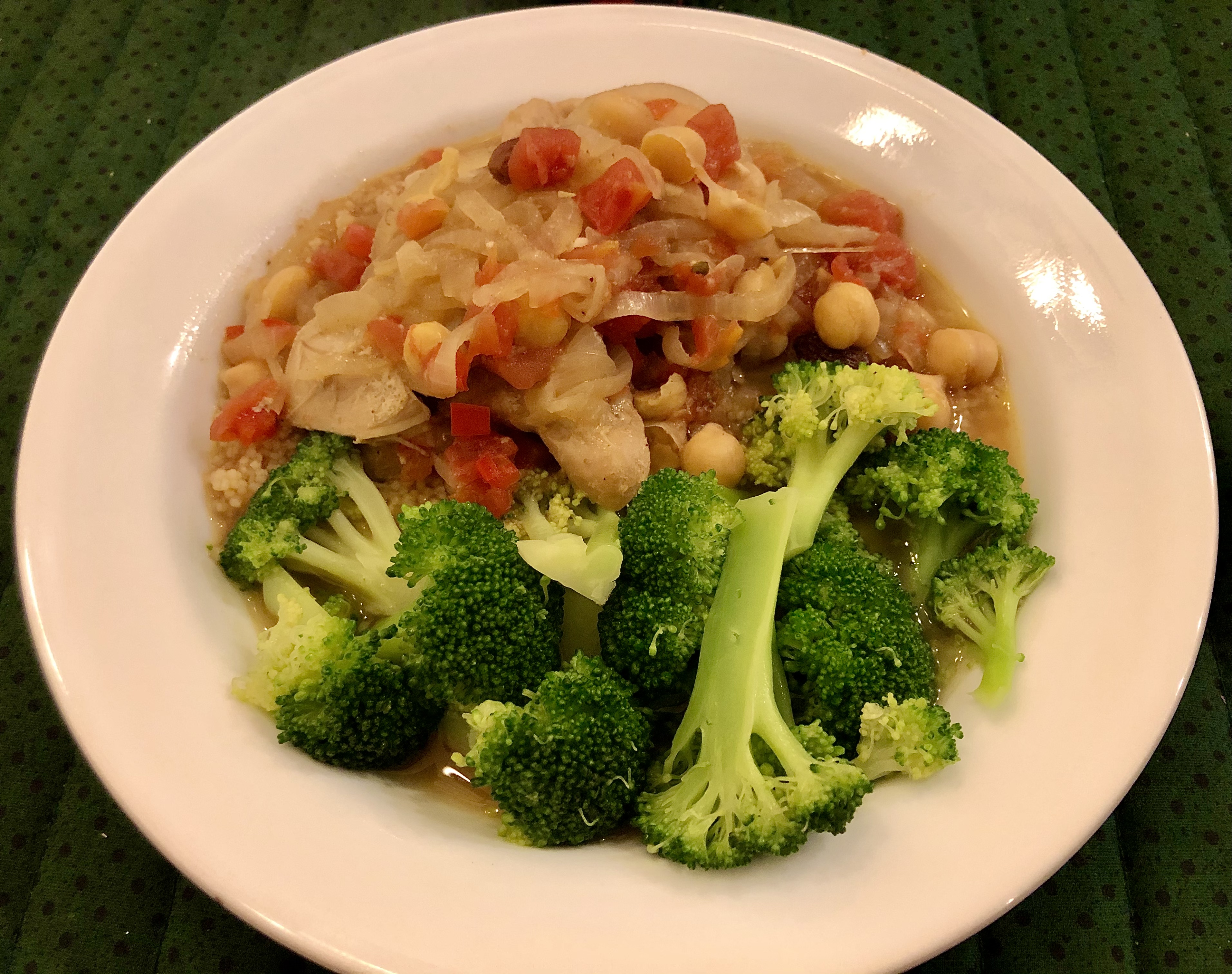 Chicken and chickpea tagine is a recipe that I found on NYtimes Cooking site. If you have a subscription you can find it here. We, of course, made some changes to lower fat and sugar and to pare down several ingredients for 2-3 servings. We made ours spicier by adding canned tomatoes with jalapeños and soupier with some additional chicken stock so the couscous could have something to sop up. Fewer raisins and only 2 teaspoons of oil made sense to us as well.