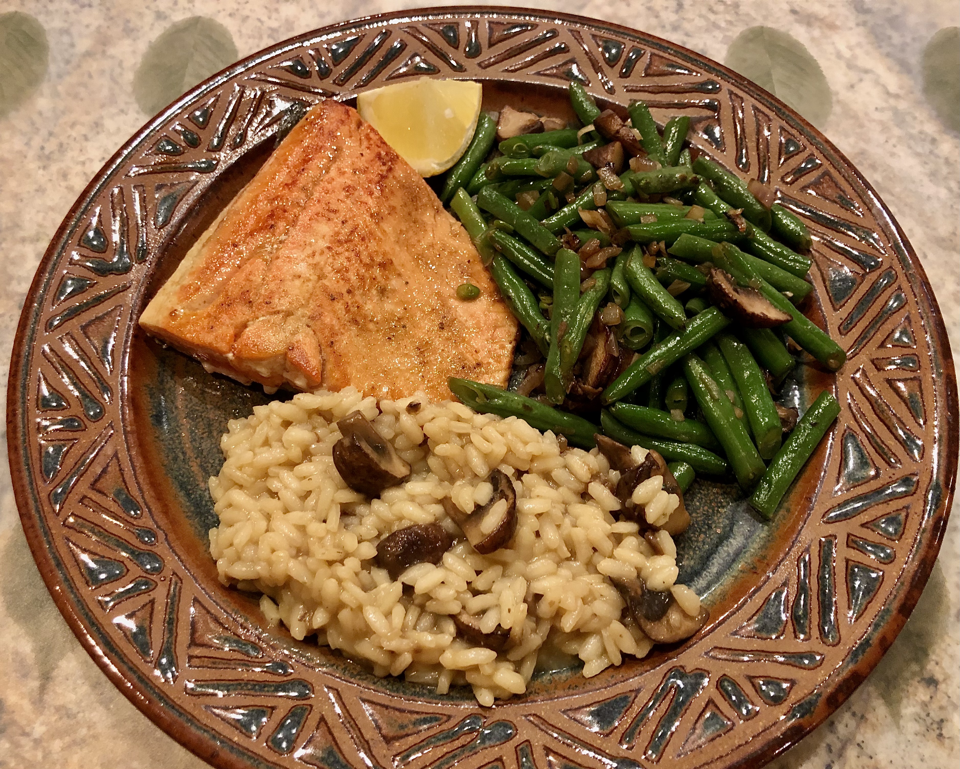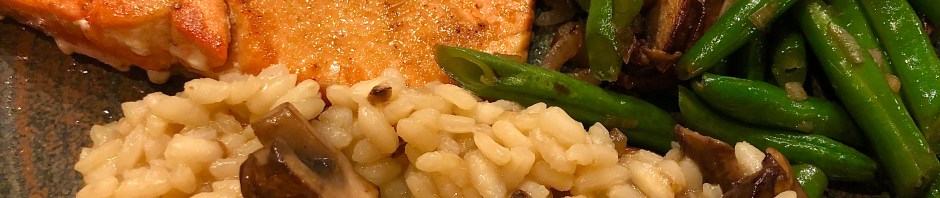 Our weekly menu is already a bit mixed up and it is only Monday! We are still making mostly the same dishes but in a different order. To start off our cooking week we made pan-seared salmon, a porcini risotto from a mix, and green beans with mushrooms and shallots.