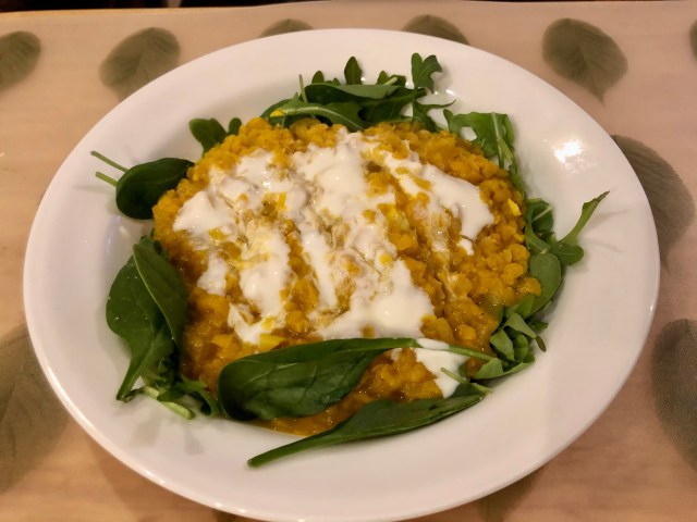 Lentils are full of fiber and an inexpensive protein. Red lentils are actually coral colored and turn yellow when you cook them. Going with the theme from yesterday to vary colors, textures, and temperatures, this red lentil stew with its gingery zing definitely fits the bill. I especially loved the bitterness of the arugula and spinach which wilted when the hot lentils were ladled on top. The plain Greek yogurt added a cooling touch. If you are vegan omit or substitute the dairy yogurt.