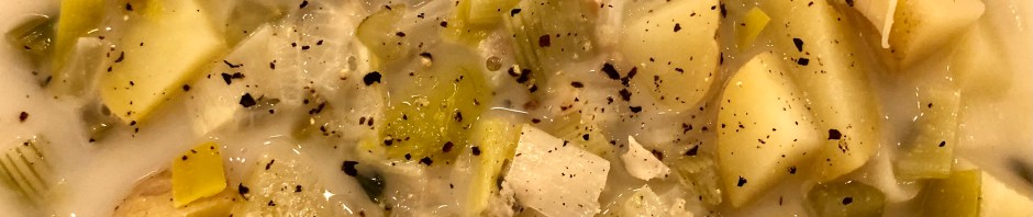 Here is how to make it even simpler. A leek is from the onion family so you can just use more onion if you have no leeks. If you are lacking fresh herbs then you can use a little from your spice rack. Milk can take the place of cream. Any type of potato cut up will do. John has suggested that we always keep some chopped clams (they are near the canned tuna) and a couple of bottles of clam juice (also by the canned tuna) in our pantry and we will never be without the means of making at least a near approximation of this delicious soup.