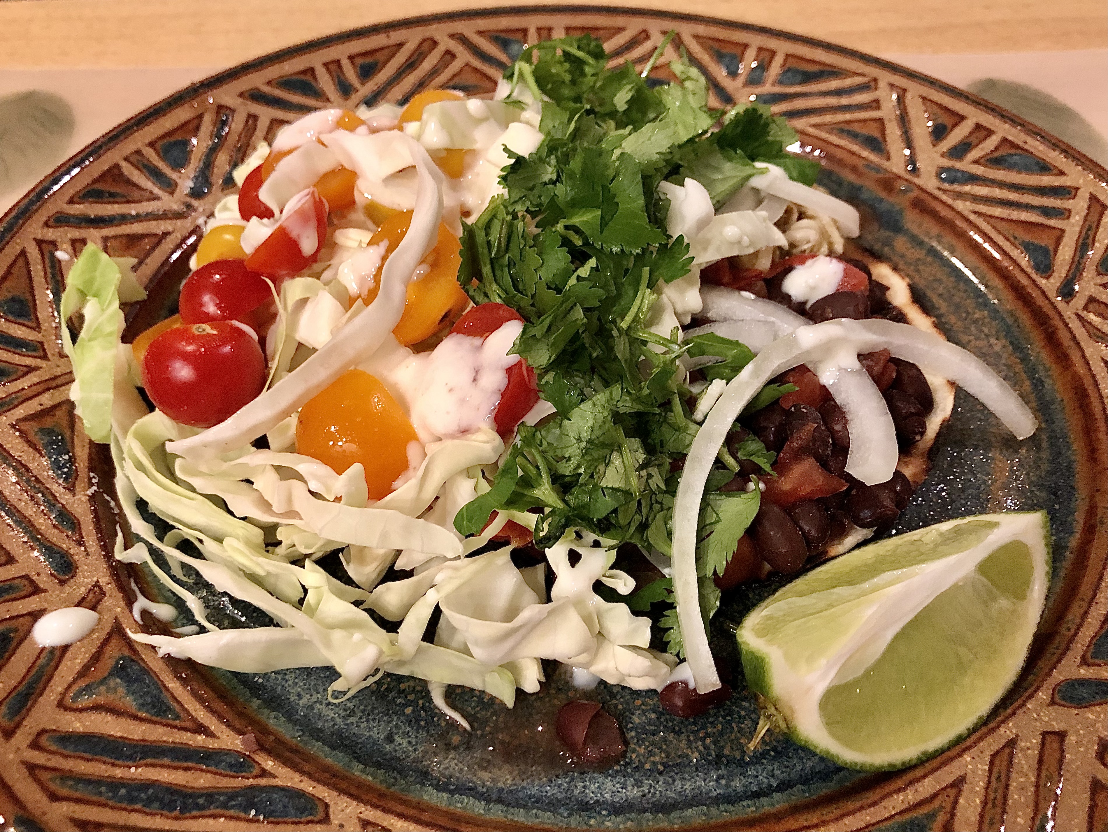 John chars the corn tortillas over the open flame of the stove, I cut up tomatoes, onions, cabbage, and cilantro, and heat up the chicken that I have shredded slowly in some jarred salsa verde. The black beans are drained and rinsed and go into a pot with canned Rotel (spicy tomatoes and jalapeños.) Once everything is heated through, it is just a matter of John and I assembling own own taco or tostada. Easy-peasey.