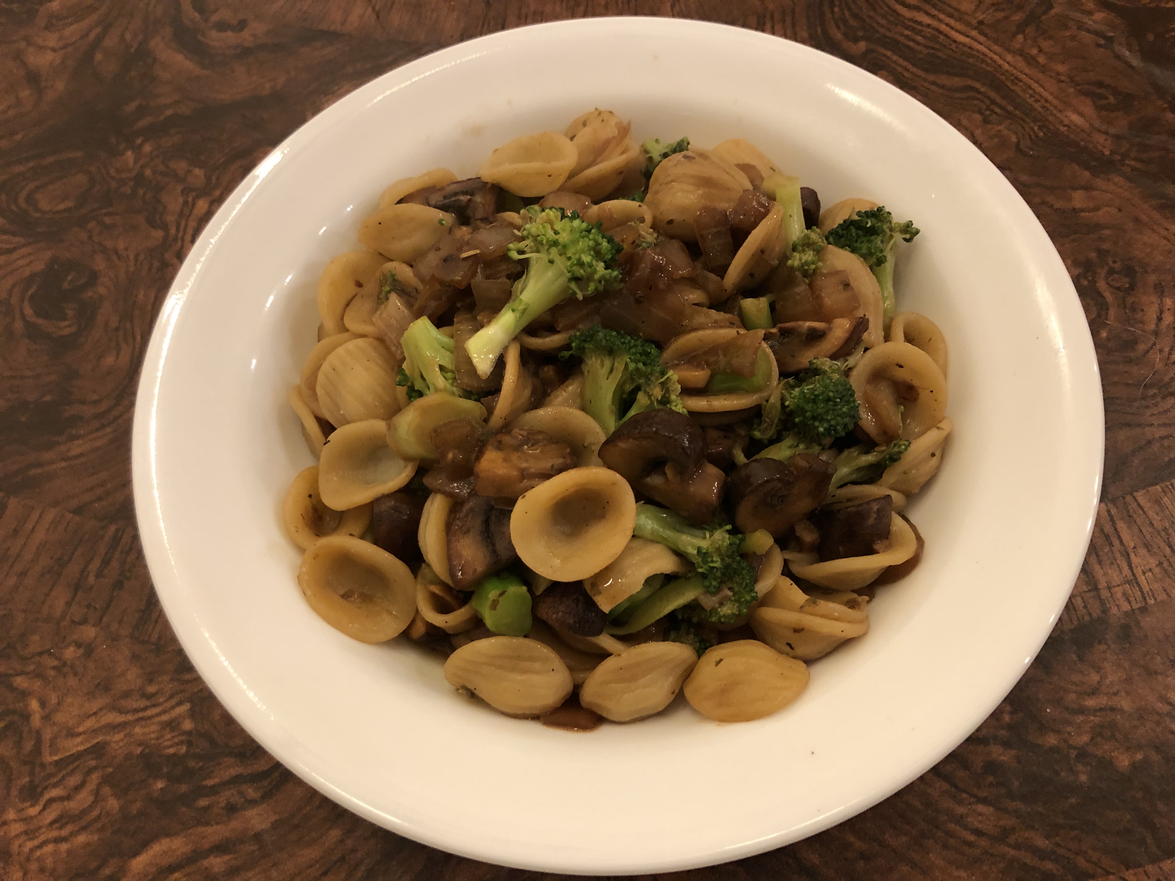Saturday night is usually a night for LFD, leftovers for dinner. However, John opined that the broth from our Mediterranean seafood stew was too fennel-y to be transformed into Vietnamese sweet and sour soup as planned. So we needed to come up with an easy dinner that we could make out of existing ingredients in our pantry and refrigerator. Orecchiette with mushrooms and broccoli definitely filled the bill!