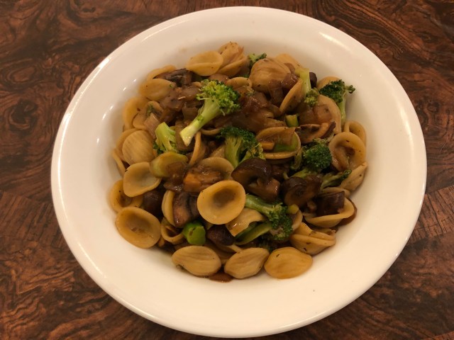 While the water for the pasta heated, John and I teamed up to get the mushrooms, onions, garlic, and broccoli cut up for the sauce. While the pasta cooked for 10 minutes, I sautéed the mushrooms, onions, and garlic and then added the broccoli florets with about three minutes to go on the pasta. John drained the pasta and added it to my vegetables. I swirled the whole thing around in the pan and added a couple of teaspoons of olive oil and a cup of pasta water which made a really yummy, rich, dark sauce. Some nights you just have to improvise!