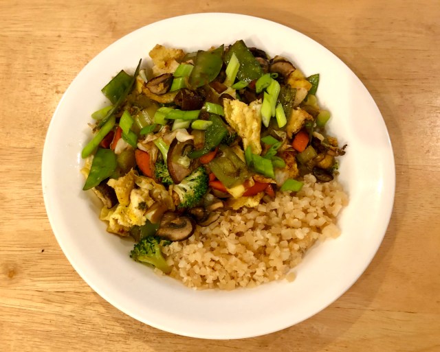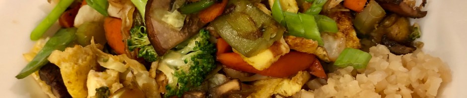I realize that this does not look much like a traditional American breakfast. However, the eggs on a Breakfast For Dinner meal are really just a jumping off point for dinner creations. For my BFD I made a rolled omelet that I had flavored with soy sauce. I took that out of the pan and sauteed my vegetables in some soy sauce, fish sauce, and oyster sauce with just a sprinkling of sugar to help them brown. I microwaved some cauliflower rice dressed with soy. Then I combined the egg into the vegetables and served myself dinner. My BFD looked colorful, plentiful, but could probably have used a little more texture. From a diet point of view, it was a bunch of vegetables and two eggs. That is a pretty lo-cal, lo-carb dinner.