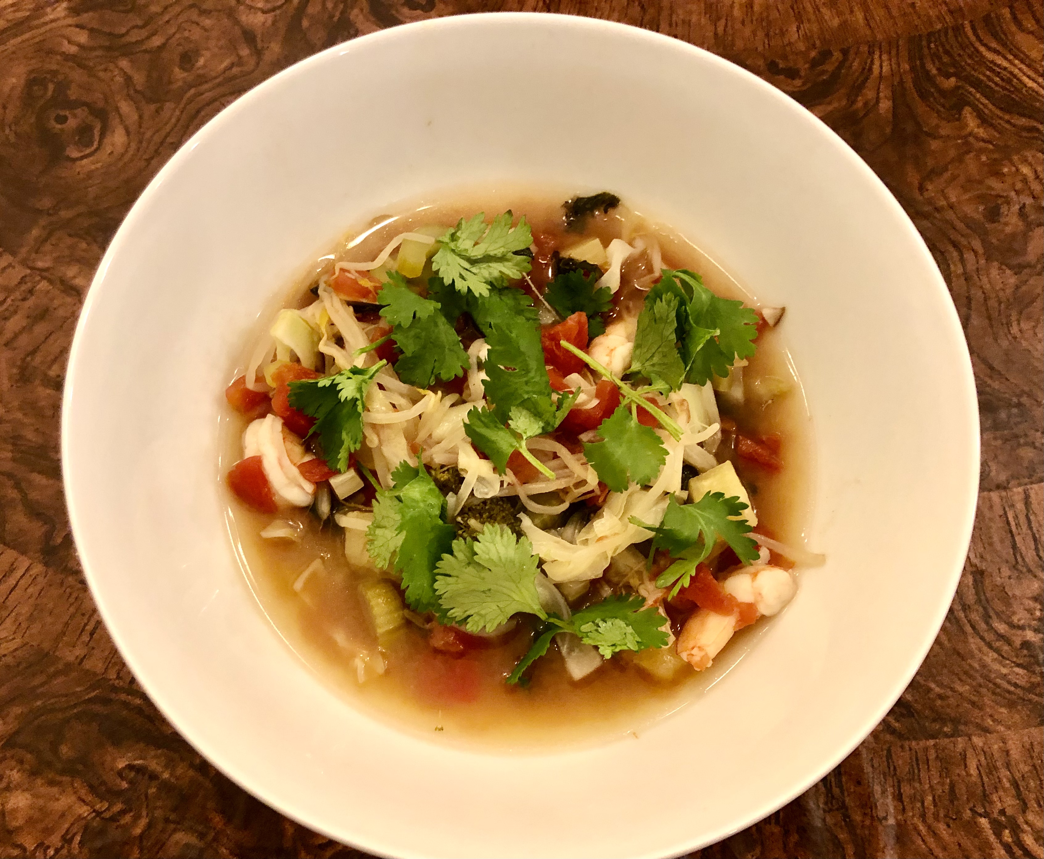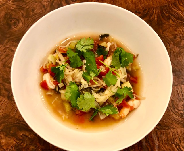 Here at home our ingredients are not quite the same. After our okra slimed out yesterday we decided to use use what we had in the refrigerator which was some broccoli, cabbage, carrots, celery, and cilantro. Although John is skeptical about the non-traditional ingredients, the soup turned out great! The tart flavor of the tamarind coupled with fish sauce and brown sugar gave an authentic taste to everything. I think I would put more shrimp in it next time. I posted the original recipe from the Saigon Cooking School the first time we tried to make it at home.