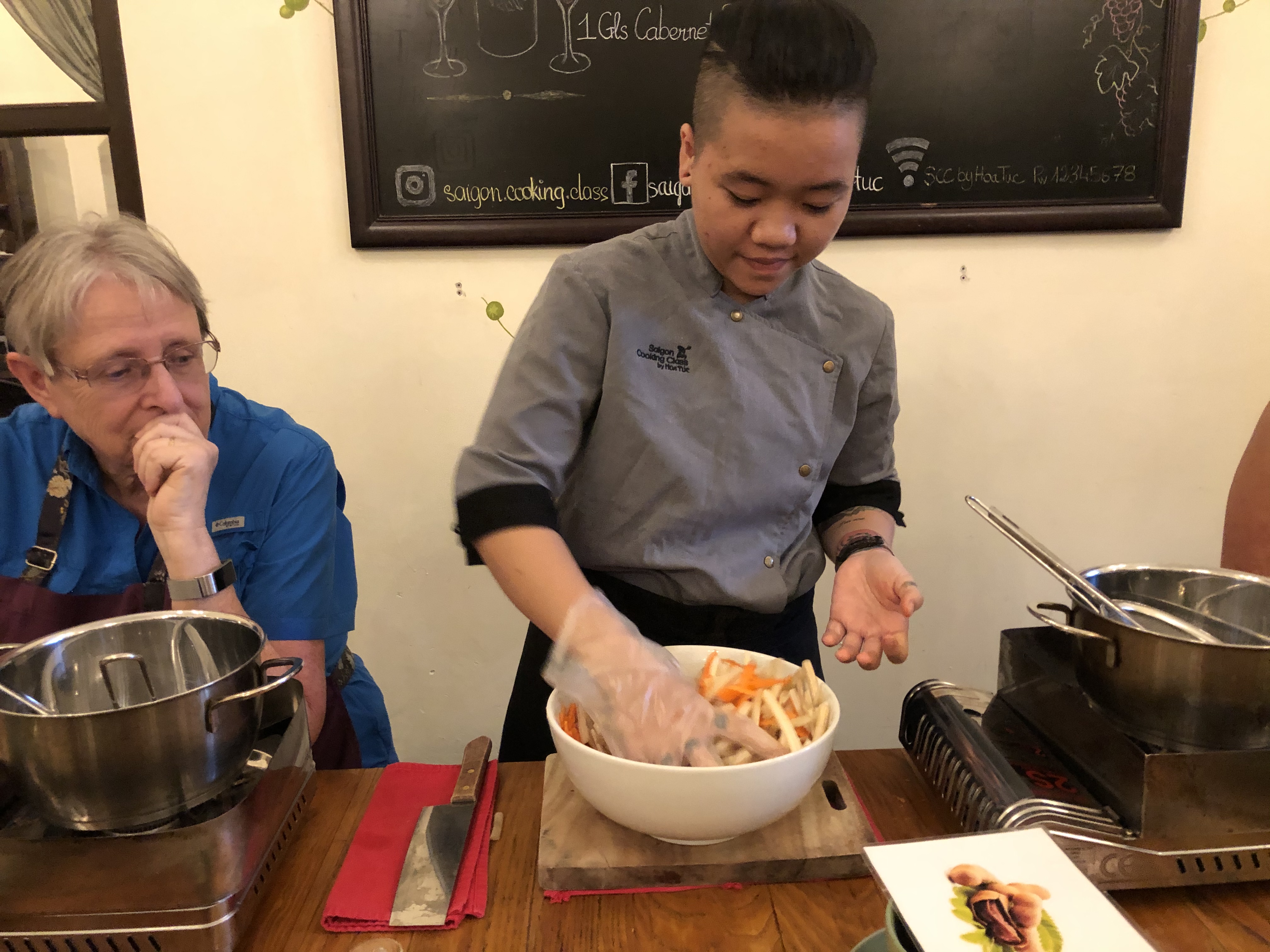 Before COVID John and I used to do quite a bit of traveling and in November, 2019 we took a trip to Southeast Asia. We started a cruise in Hong Kong and made our way down Vietnam, then to Cambodia, and ended up in Thailand. One of the things we signed up for was a cooking class in Ho Chi Minh City. The chef in Vietnam took us to the Ben Thanh market and discussed ingredients and then we went back to the Saigon Cooking School and made a three course meal. Here are some pictures.
