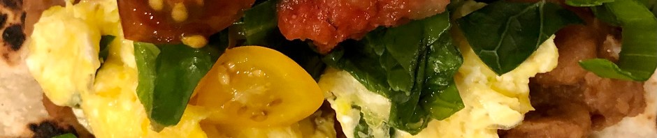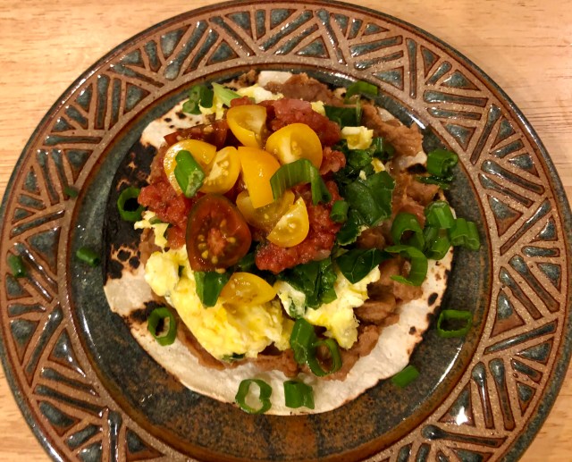 Sunday’s Breakfast For Dinner was so enjoyable that after I cleaned my plate for the first time, I retooled and made a second tostada. I really enjoyed the contrasting flavors, spiciness from the salsa, bitterness from the wilted greens, and psuedo fatiness from the eggs and refried beans. I am definitely a fan of non-fat refried beans! My dinner also had variation in texture, temperature, and color.