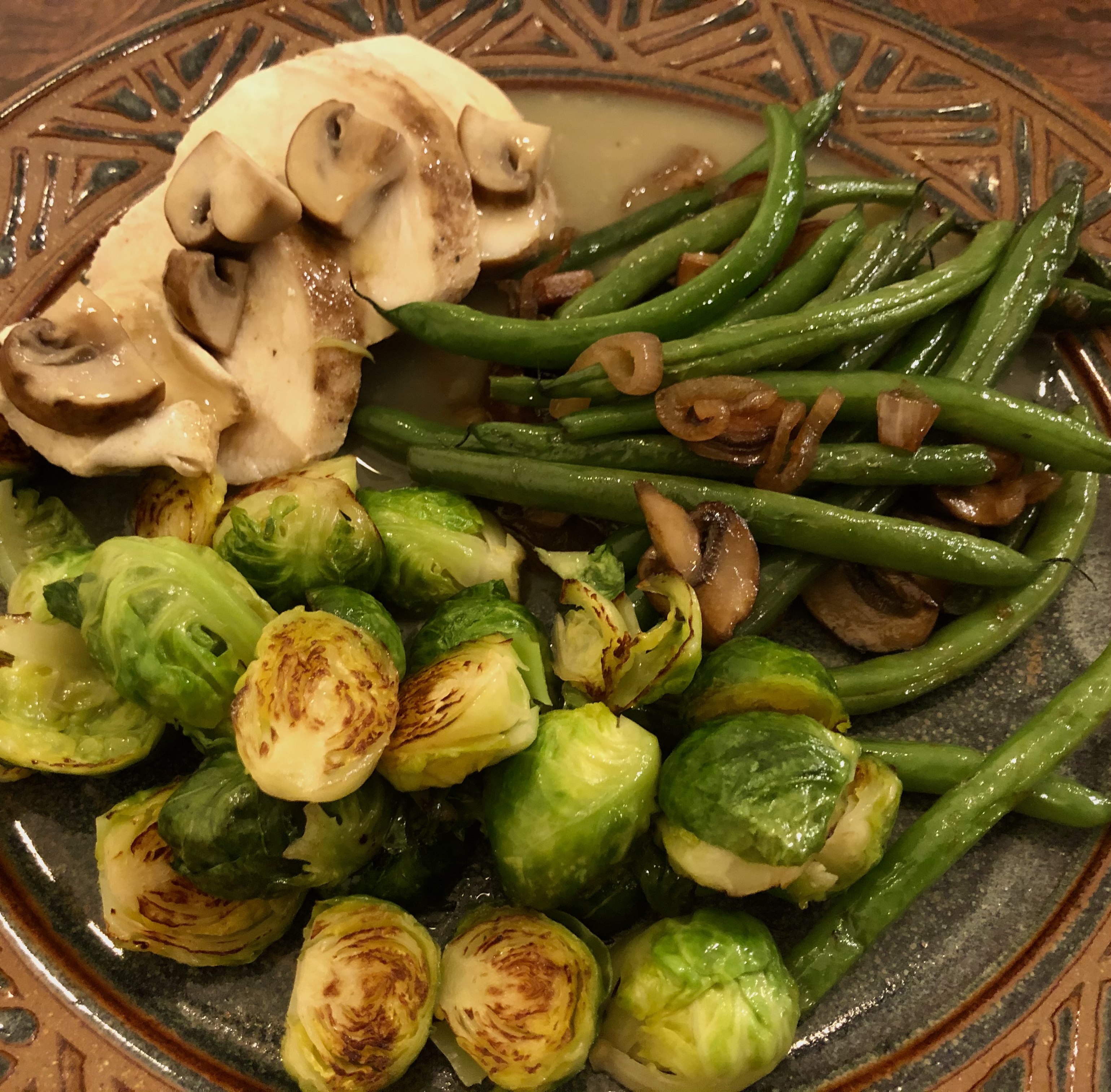 Sous vide chicken breast with chicken mushroom gravy, Brussels sprouts, and green beans with shallots and mushrooms
