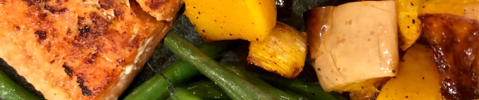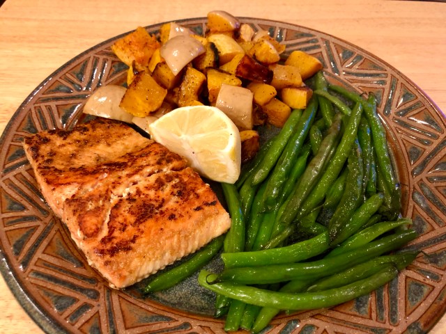 As the weekdays approach the weekend, the dinners get easier. As you know John and I cook relentlessly except when we are on vacation (remember vacations?!) By Fridays we are pretty much cooked out and are looking forward to some easy meals. Salmon takes about three minutes in a hot pan so when the vegetables are almost done I tell John “go!” And he quickly cooks the fish. Easy peasey.