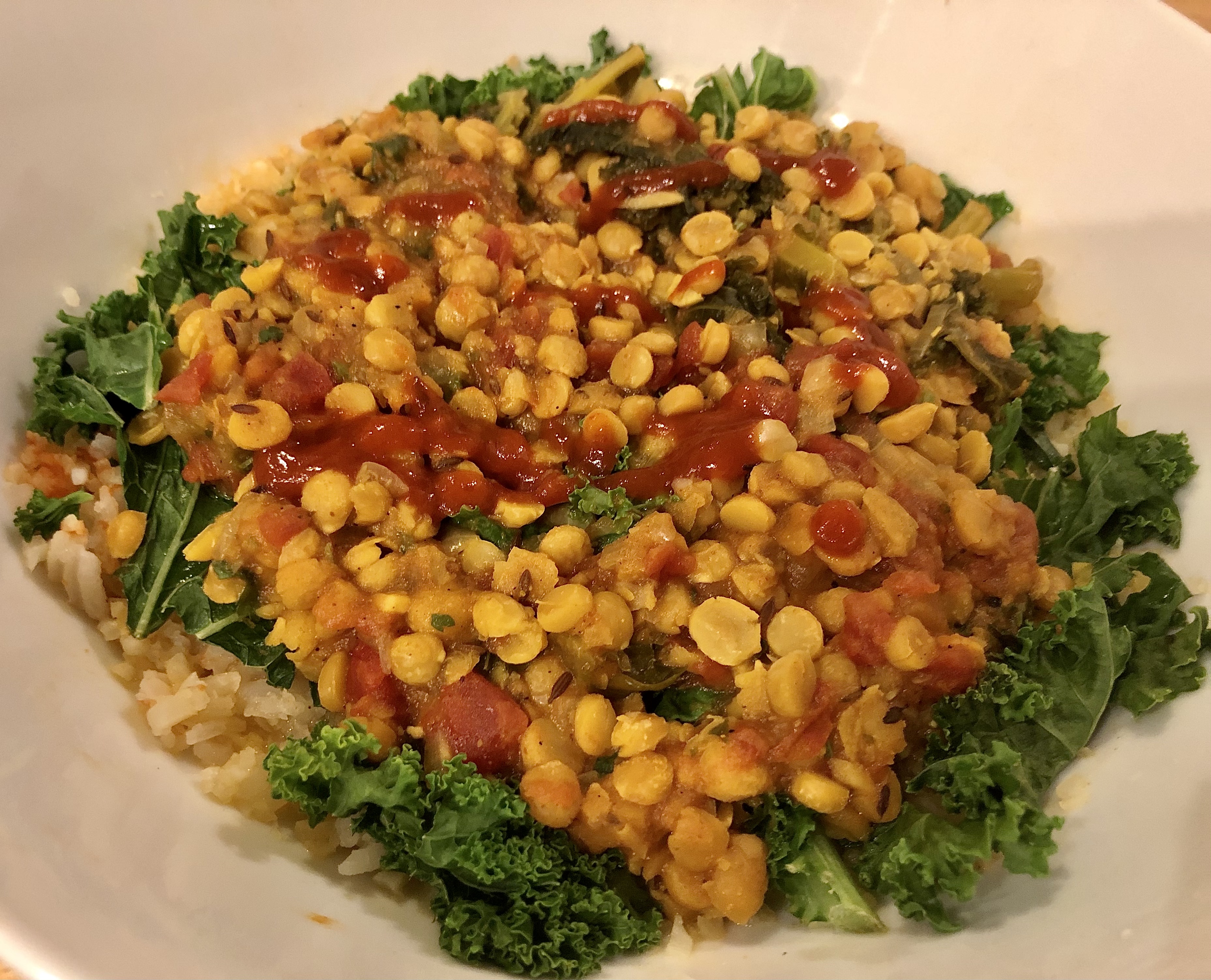 We added a little more broth to the pot since the split chickpeas had been busy sopping up the liquid in the dish while they waited for us to eat them. I think on Monday I had mixed greens and this time it was straight kale. I did cut the cauliflower rice with a little regular white rice to give it more chew. Once again I finished my bowl with sriracha for a spicy/sweet kick.