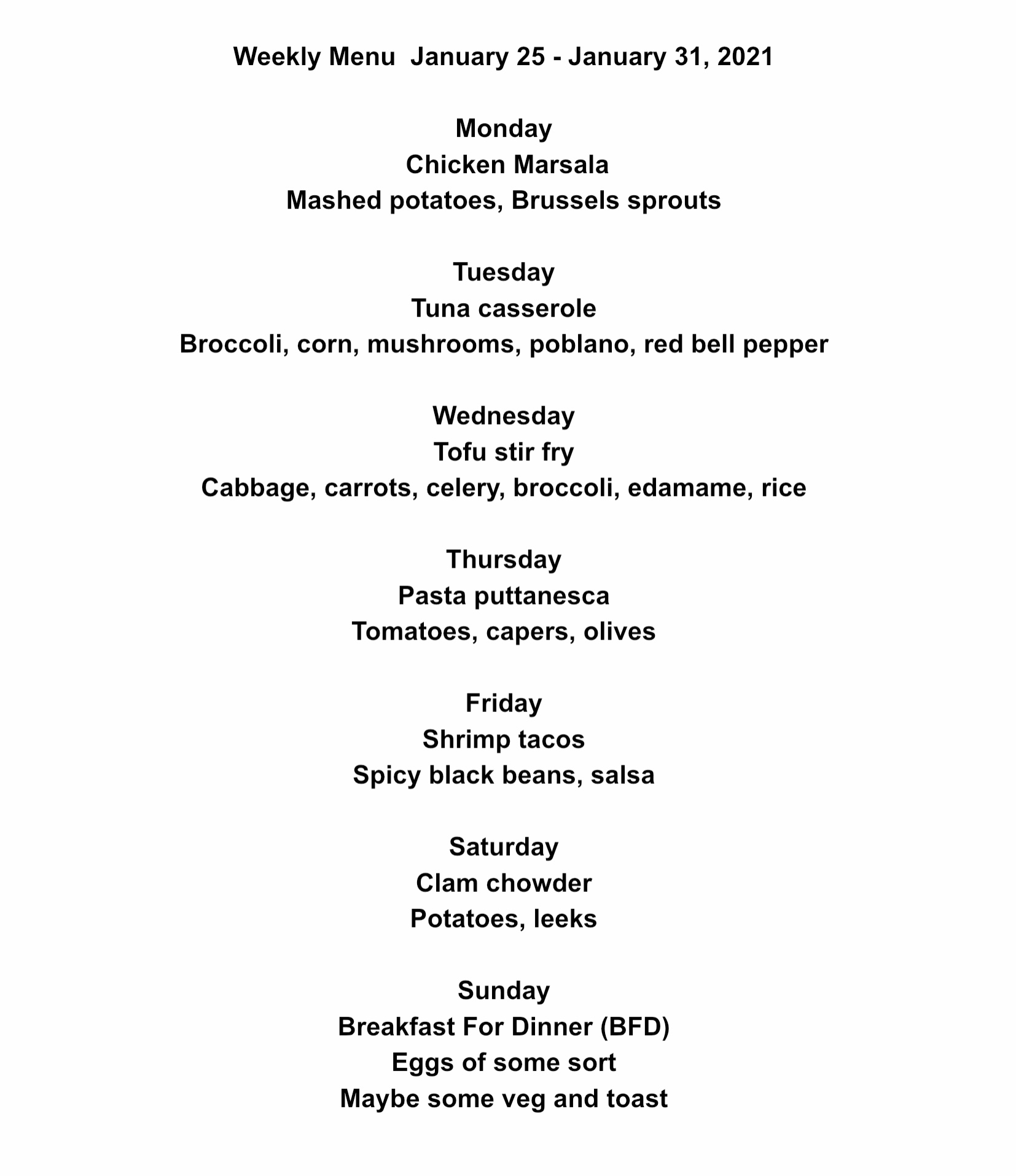 Here we are at the end of January, a month that both crawled and sped by like so many months since COVID-19. This week has 3 vegan or vegetarian dinners, 3 seafood, and 1 chicken. For new dishes we are having Chicken Marsala and are trying to cobble together some sort of tuna casserole with some less fattening goo to hold it together. What are you planning this week? When you take the time to plan your week you will find that the shopping, cooking, and eating in healthy manner happen much more easily.