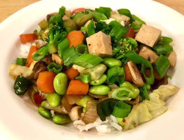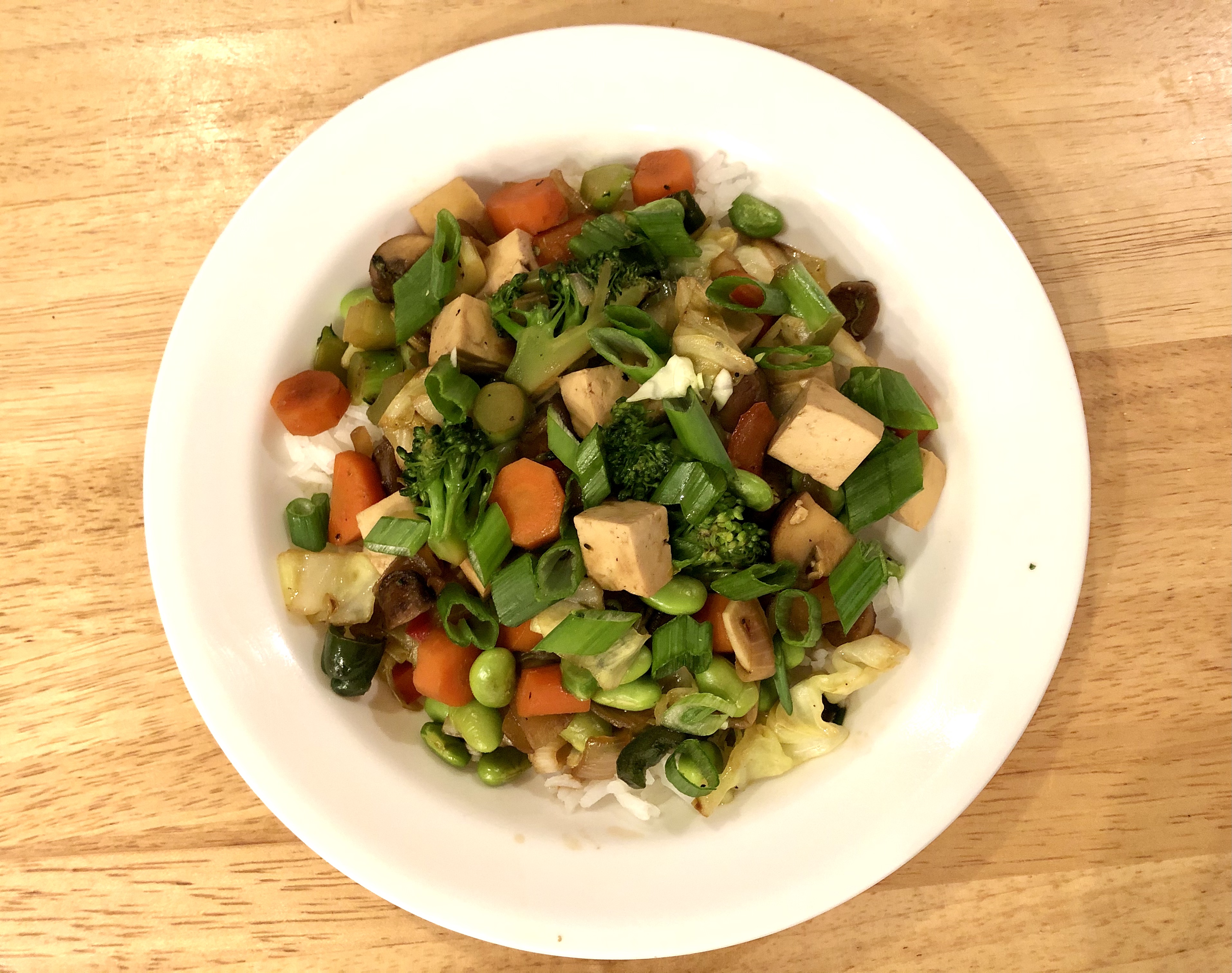 John and I, working together, got the dinner made quickly. I was at my chopping board cutting up the vegetables in the order that they were going into the pan and John was doing the stir-frying. We started with the mushrooms and ended up with the edamame and tofu squares that John had marinated earlier in the day. He also made some rice while I was out with our daughter for our weekly drive-thru lunch.