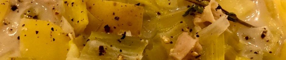 In the Dutch oven, heat the olive oil, and add onion, celery, leeks, potatoes, tarragon, and thyme, stirring to coat. Season with salt, and cook over low heat until the vegetables have just started to soften, taking care not to brown, about 5 minutes. Deglaze with white wine and then add the clam juice and reserved clam liquid. Simmer until potatoes are al dente.