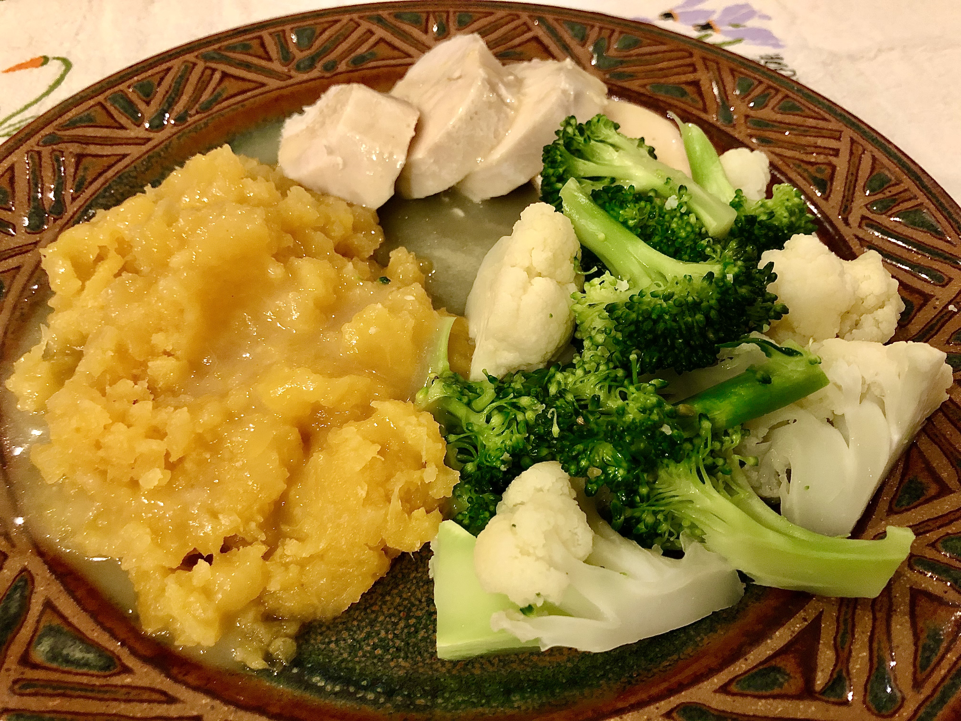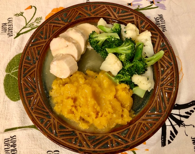 I finish out the dinner by mashing the rutabagas and steaming the broccoli and cauliflower. Classic chicken dinner is always a winner at our house.