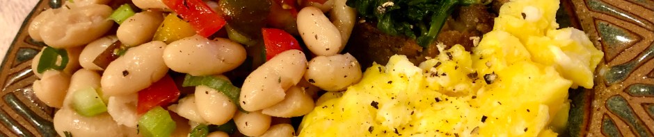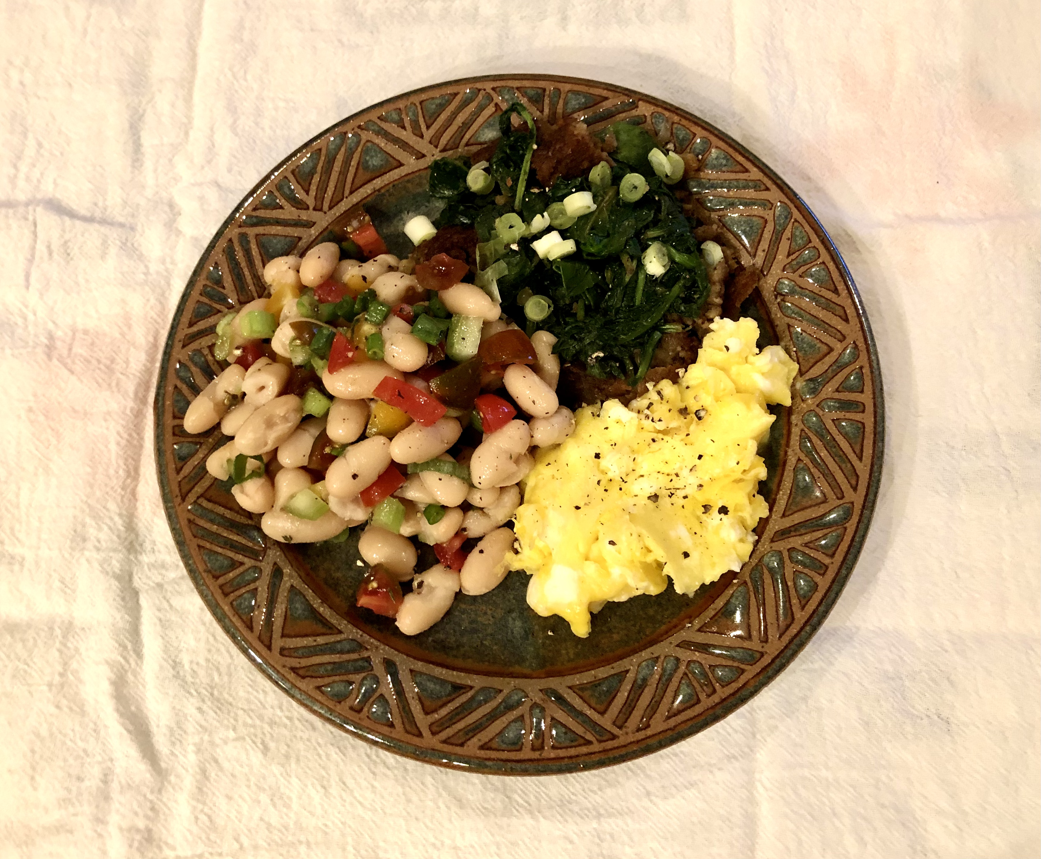 Scrambled egg, sautéed kale and spinach with crumbled veg patty, cannellini beans with tomatoes, celery, and scallions