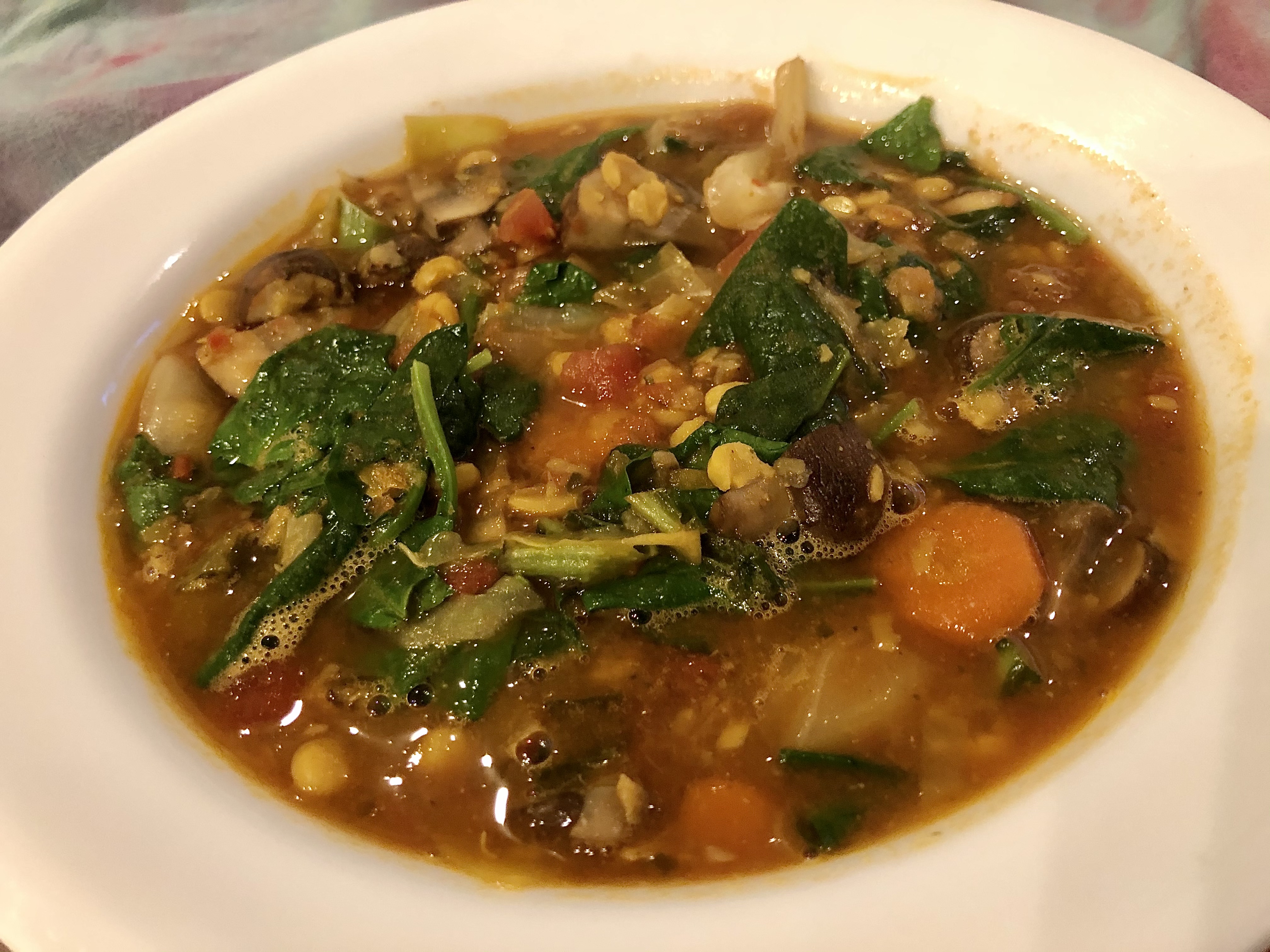 For Leftovers For Dinner I sautéed some mushrooms, cabbage, and kale stems and then added them to the split chickpeas and split pigeon peas stew. I added more broth to it to make it soupier. It seemed to be lacking acid and I also had leftover sauce from the adobo so I put some of that in as well. What ended up was an interesting and complex soup that we were able to stretch to two bowls a piece. Taking an already economical meal and adding probably less than $1 worth of ingredients to make a second meal makes me happy! Waste not, want not!