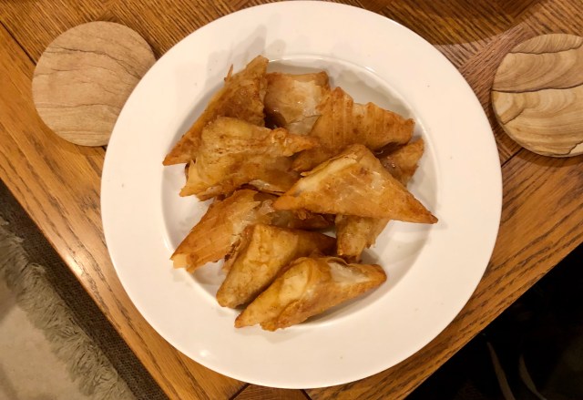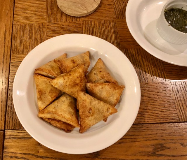 Rather than make our own triangular food we hit the frozen food aisle to try to find some already made items. We were actually hoping to find spanakopita but no luck. We ended up with samosas that were stuffed with chickpeas and a tamarind chutney and came with a delicious cilantro sauce. I am planning on using this new found sauce on many things in the future. The samosa manufacturer, Sukhi’s, was nice enough to put the recipe online. Recipe for cilantro sauce.