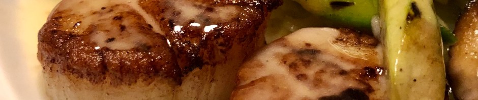 Among his many admirable abilities, our son is also a good cook. Since we are on vacation together currently he offered to make a special dinner. The whole family used to enjoy going out to the now defunct Oak City Grill in Menlo Park. My favorite dish was seared scallops in a beurre blanc sauce with mashed potatoes, braised leeks, asparagus, and mushrooms. This was the dish he recreated for us.