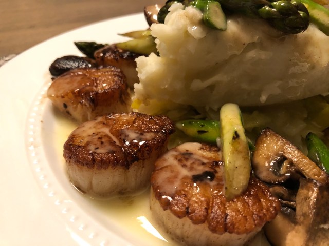 Seared scallops in a beurre bland sauce with braised leeks, mashed potatoes, asparagus, and mushrooms