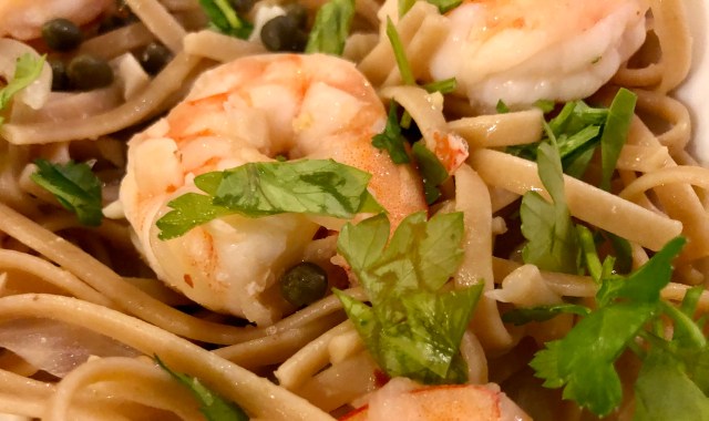 Light shrimp scampi with whole grain linguineSlight change in plans for dinner tonight. We were supposed to be having classic chicken but when we went in the freezer there was no chicken. So we made Friday’s dinner instead. You never have to twist my arm to eat pasta!