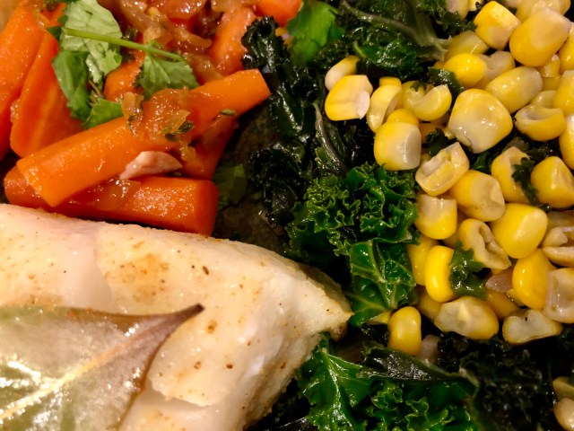 Since I am being careful with my diet this week due to overdoing it last week, I made two vegetables instead of a starch and a vegetable. After cooking some garlic separately and adding it back in at the end of cooking, I steamed the kale and corn in a little water. I did add a pinch of sugar and a tsp. of butter to help soften the bitterness of the kale.