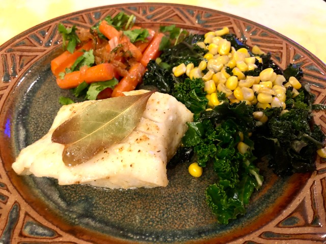 Oven-roasted Chilean sea bass, Vichy carrots, steamed kale and cornPatagonian toothfish or commercially known as Chilean sea bass (a misnomer) is a delicious fatty white fish that lives near Antarctica. It has been over-fished and poachers continue to make a catch of more than two times the legal amount. So it is important to buy it from lawful providers.