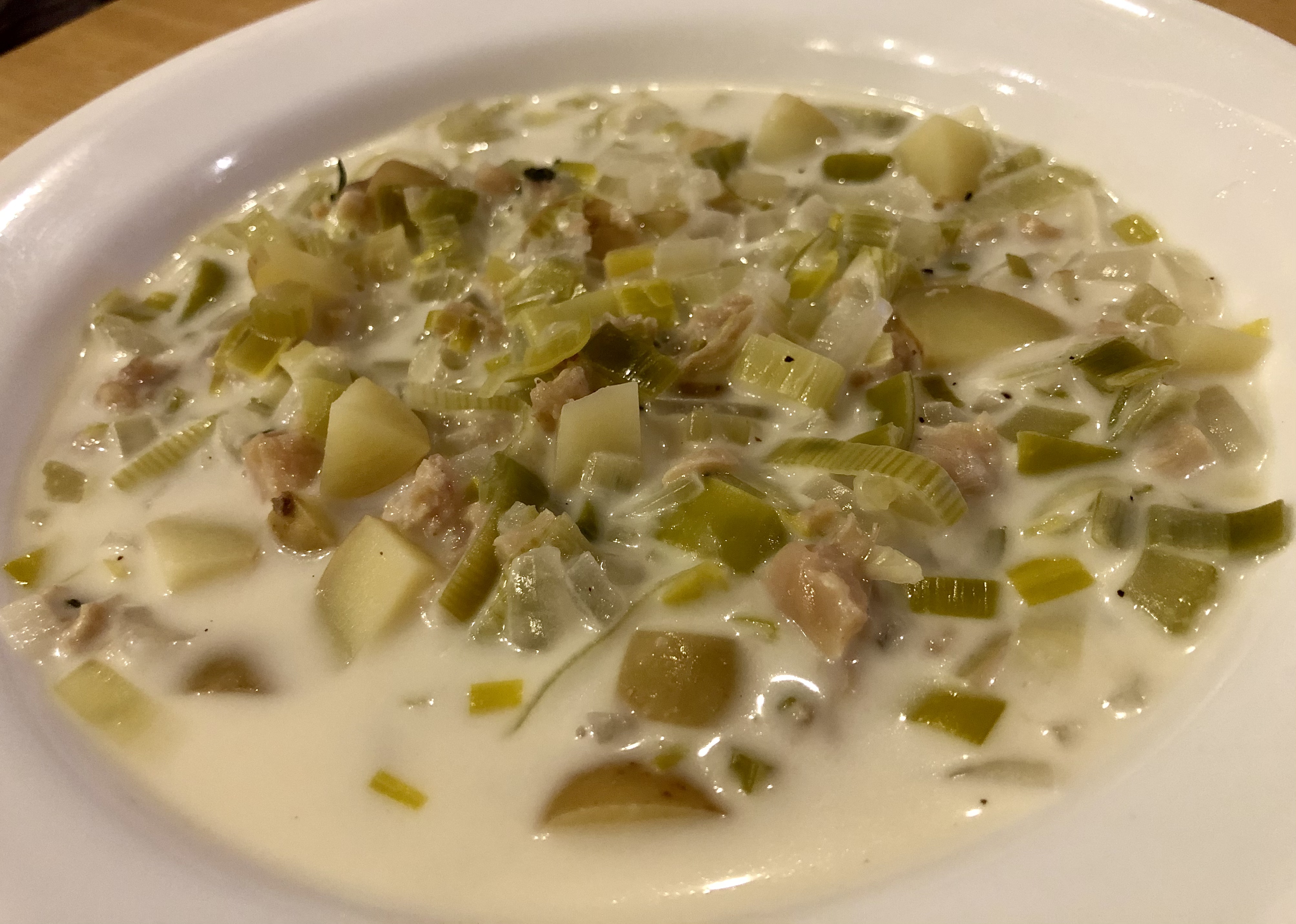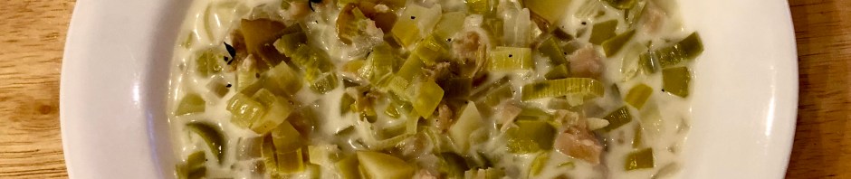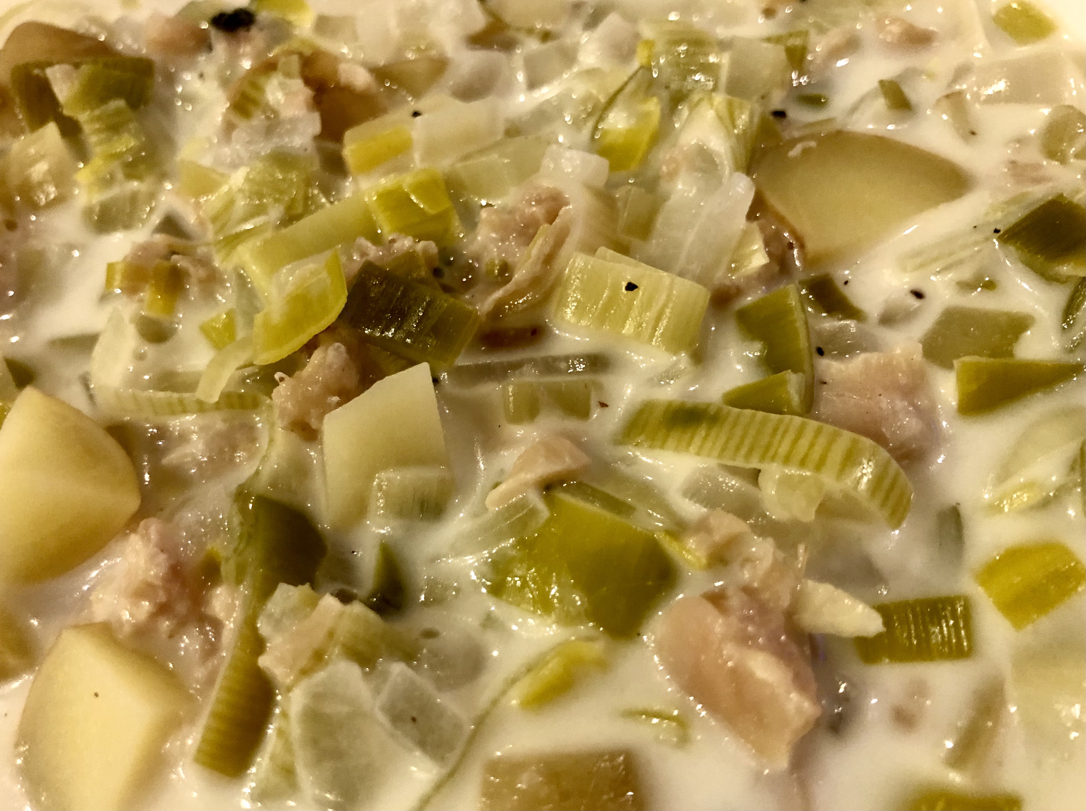 Last real cooking day of the week since Saturday is LFD (Leftovers For Dinner) and Sunday is BFD (Breakfast For Dinner.) I have gone off menu with this selection since I had to rejigger my plan earlier in the week. This chowder is a great pantry recipe with only the leeks (which you could probably substitute with more onion) as an outlier ingredient.