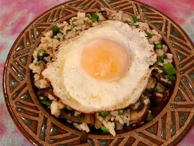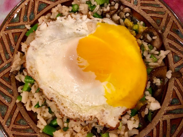 Since asparagus is coming into the market I bought a big bunch this week in preparation for asparagus carbonara on Tuesday. There was plenty besides for John and me to use in our BFD (Breakfast For Dinner) Sunday. John put his asparagus pieces in an omelet (again!!) and I sauteed my diced asparagus with some onion and mushrooms and combined them with some leftover rice. I kept this mixture warm while I made my egg. First I cracked the egg in a little bowl because I was concerned I might break the yolk. Then I slid the egg into a pan that I had sprayed with olive oil spray and cooked it sunny side up. I put a little liquid in the pan and covered it towards the end of cooking to get a thin skin over the yolk.