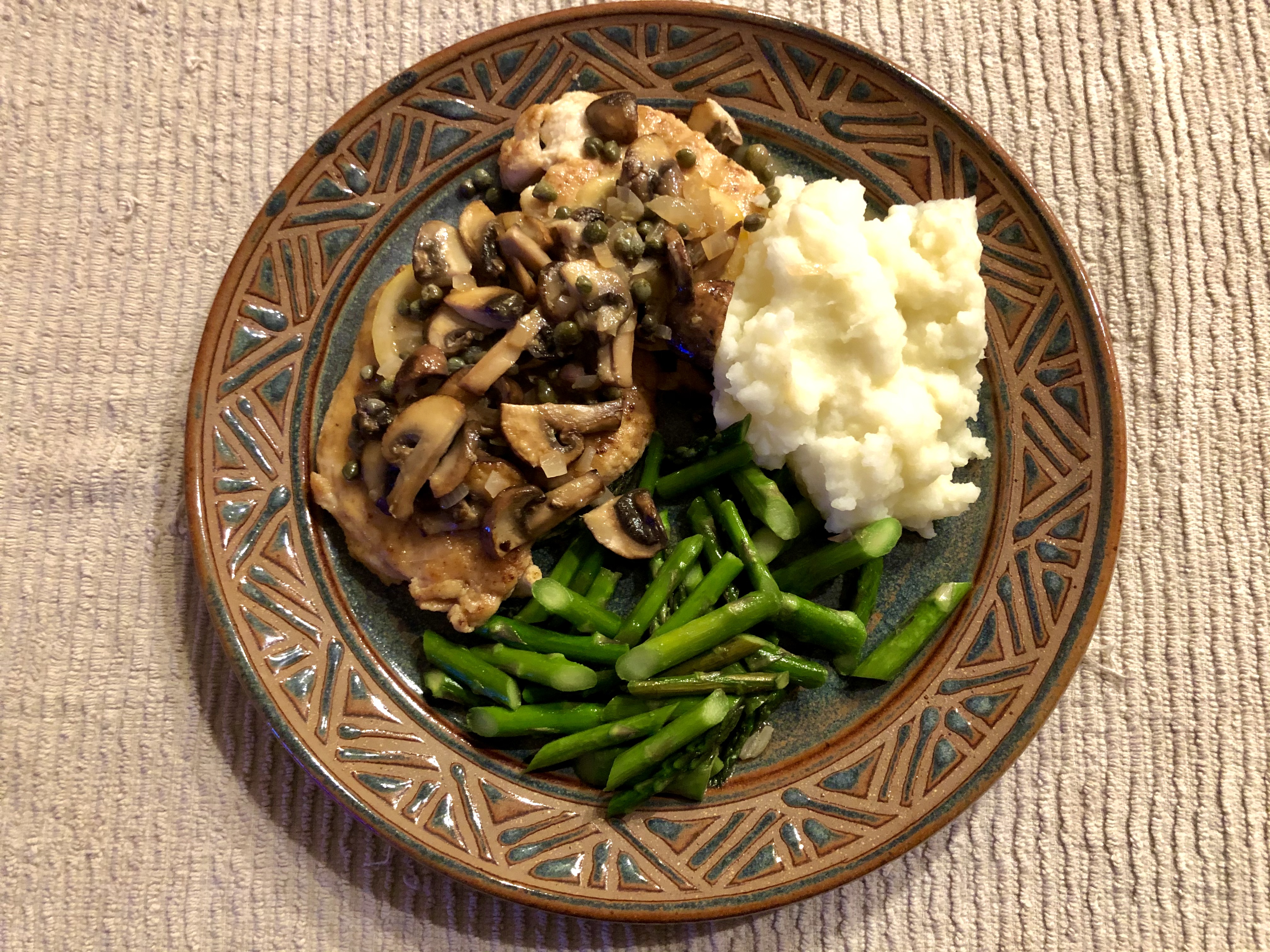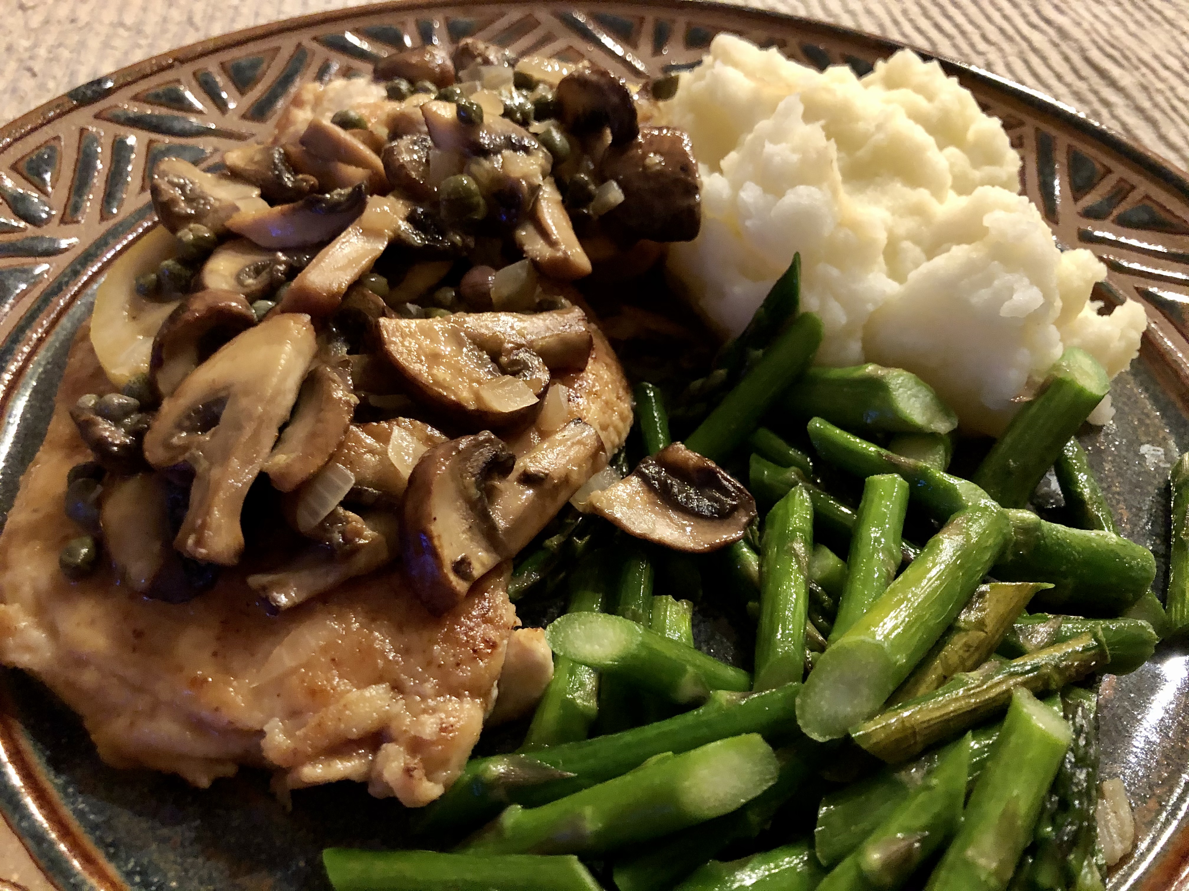 Chicken piccata, mashed potatoes, asparagusSince I was tired of our usual Classic Chicken, I pushed for a different way to make chicken this week. We came up with chicken piccata which is basically chicken breast pounded out, seasoned with salt and pepper, and dusted with flour. John sauteed the chicken in olive oil spray and a teaspoon of olive oil. The sauce is made out the chicken drippings, chicken stock, white wine, lemon juice and zest, shallots, mushrooms, capers, garlic, and a teaspoon of butter swirled in.