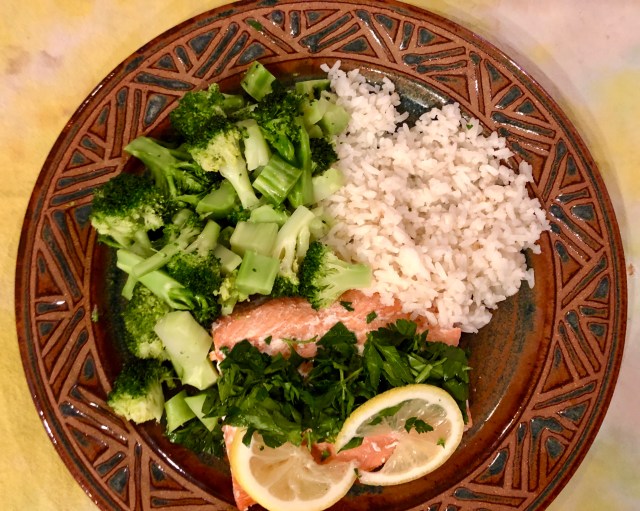 John and I had a disagreement over how to cook the salmon. I read somewhere that you should cook it in a 400F oven for 10 minutes an inch on a rack that has been sprayed with an oil spray over a sheet pan after bringing the fish to room temperature. John wanted to put salt in the bottom of a cold pan and slowly cook it over medium heat. Since I am not the protein cooker in our house, his method won out.