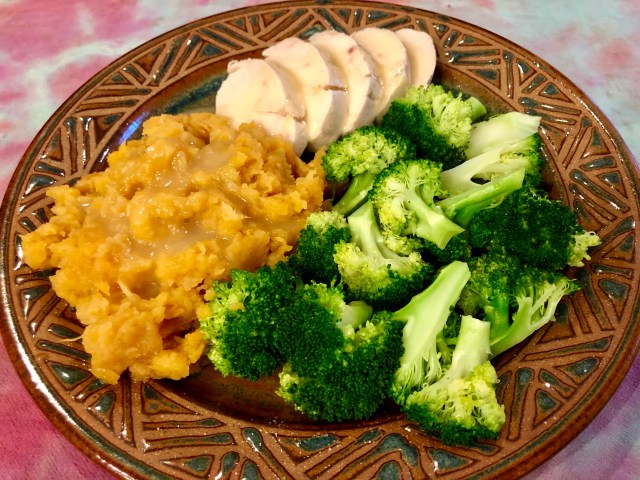 I cooked the rutabagas in the Instant Pot for 15 minutes. An observation about rutabagas, we get unwaxed ones out here in California but they are not nearly as sweet and delicious as the big waxed ones. Occasionally we find waxed ones at Walmart and the difference is amazing. I guess the sugars in the rutabagas must develop during storage. Tonight’s rutabagas were quite bitter. I tempered the strong flavor by mashing them with a little butter.