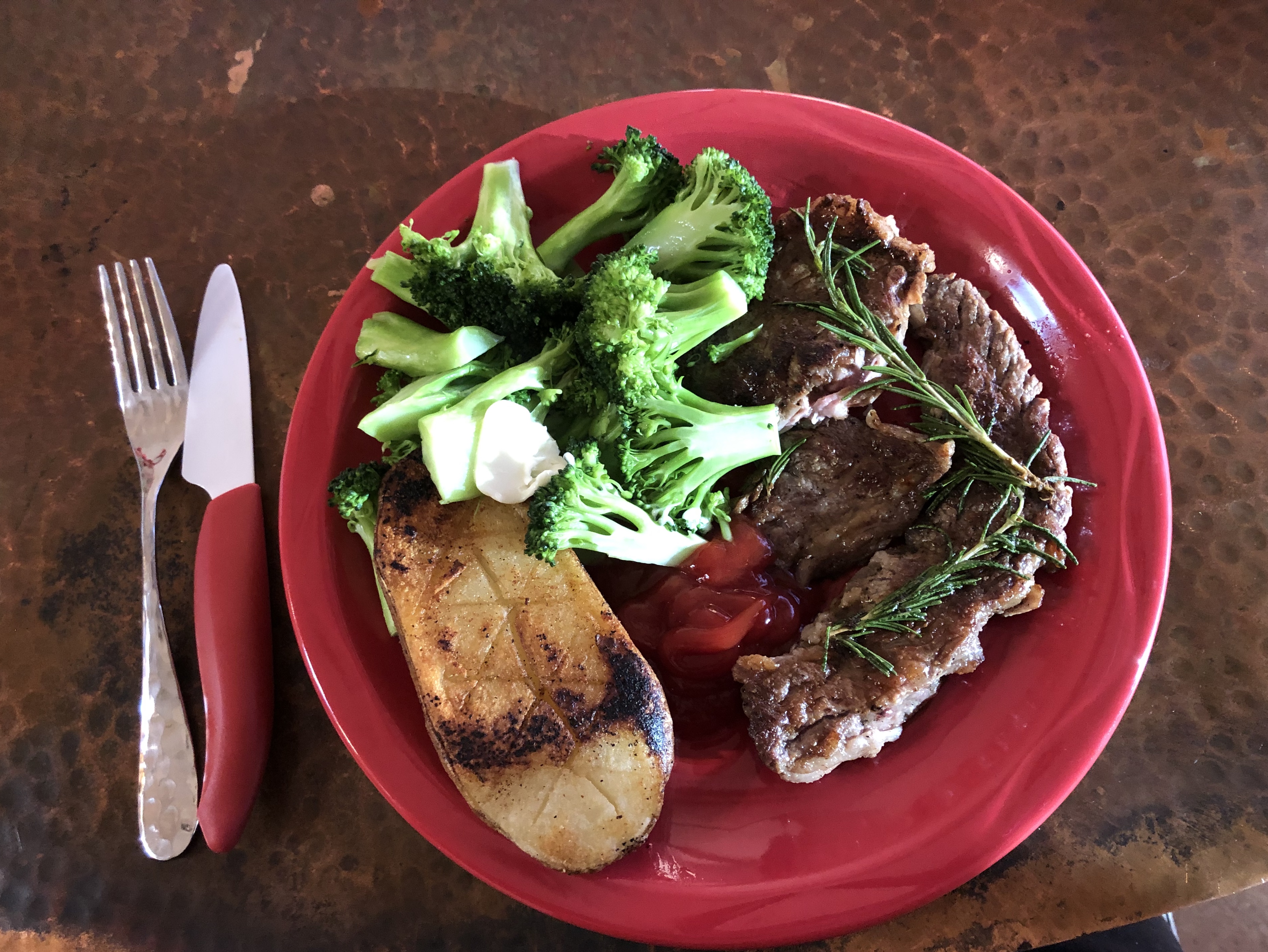 John cooked the steak in a little olive oil and rosemary. If we had been home he would have grilled it outside but it turned out really tasty nonetheless. I microwaved the potato until it was almost done and the seared the cut side in a pan with a little butter. The broccoli was simply cooked in a little water.
