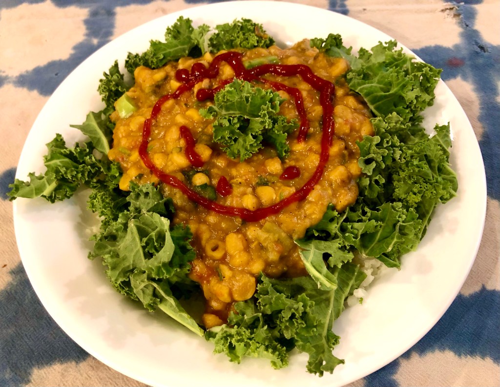 It looks familiar because this is the other half of the double portion of Chana dal we made on Monday. What a pleasure to know that Saturday night’s dinner only needs a reheat and a little time spent taking the stems off the kale and defrosting and microwaving the cauliflower rice.