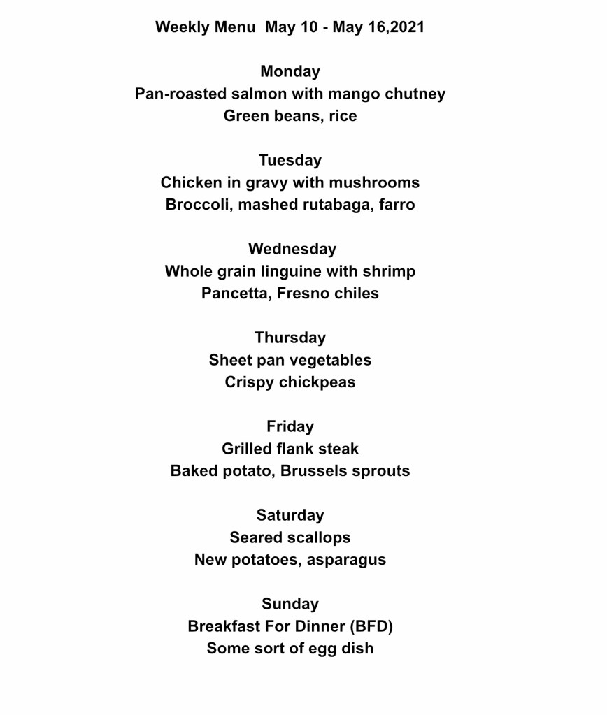 This week is a slight departure from our norm. After suggesting that planning for leftovers is a good idea, this week I did not do advance planning for Saturday. So by the time Saturday rolls around I will be checking the fridge for bits and pieces and if there are none, we’ll be having scallops. (I hope that there are no leftovers, LOL.)