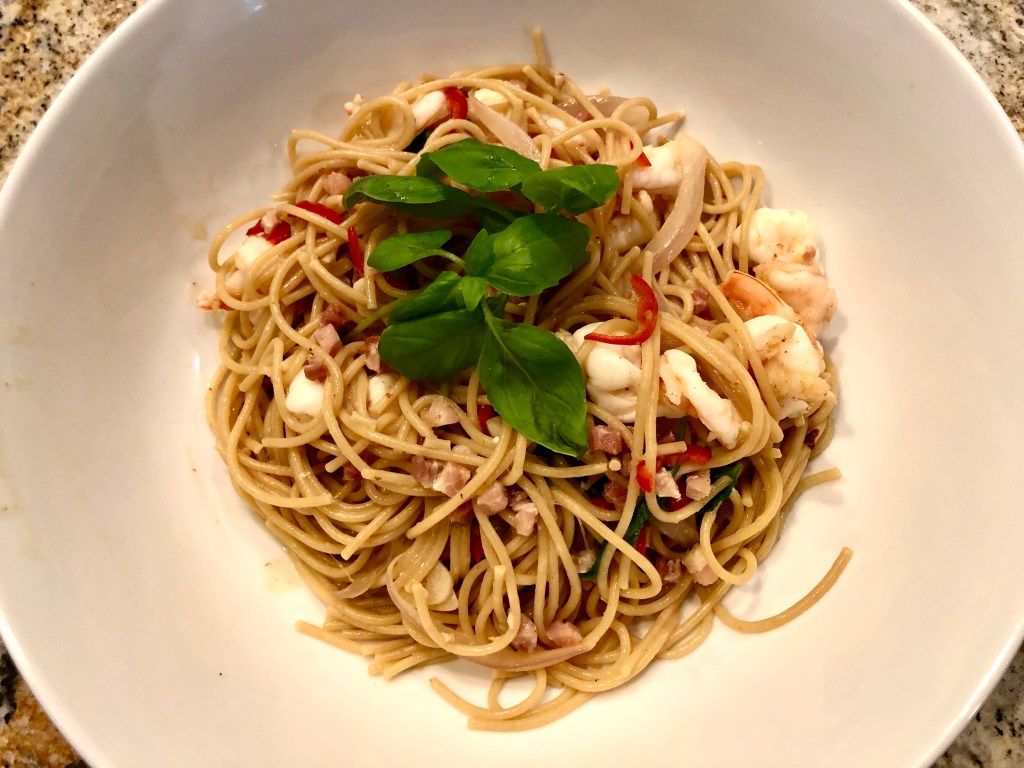 Spaghetti with pancetta, shrimp, and Fresno chiles. Serves 2